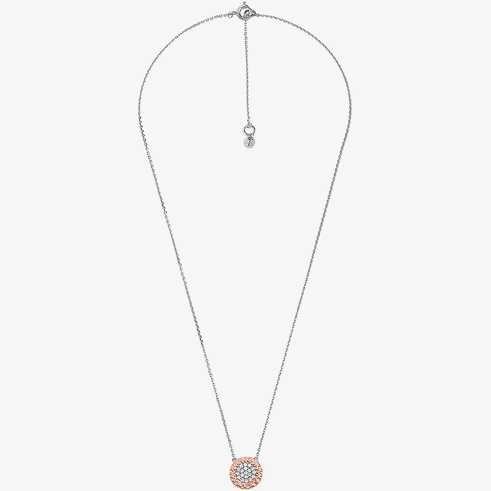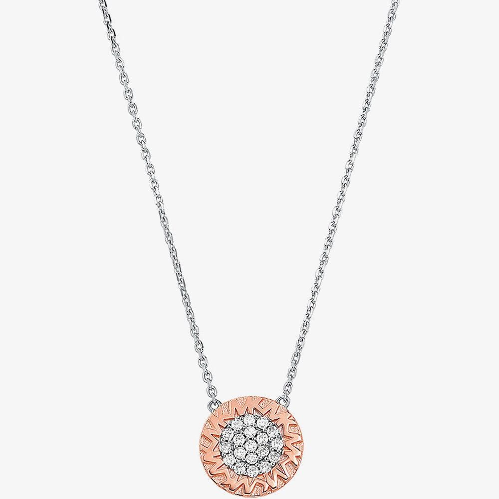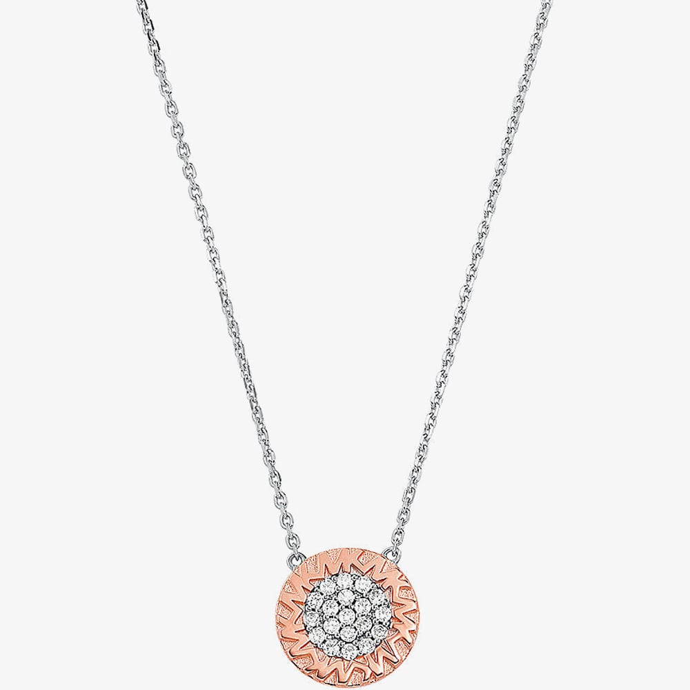 Michael Kors brings us this beautiful sterling silver necklace which features an attractive pave set crystal centre & a MK logo rose gold-tone surround. This necklace is completed on an adjustable bolt ring fastening to suit comfort & style. Adjustable 46cm plus 5.1cm.
