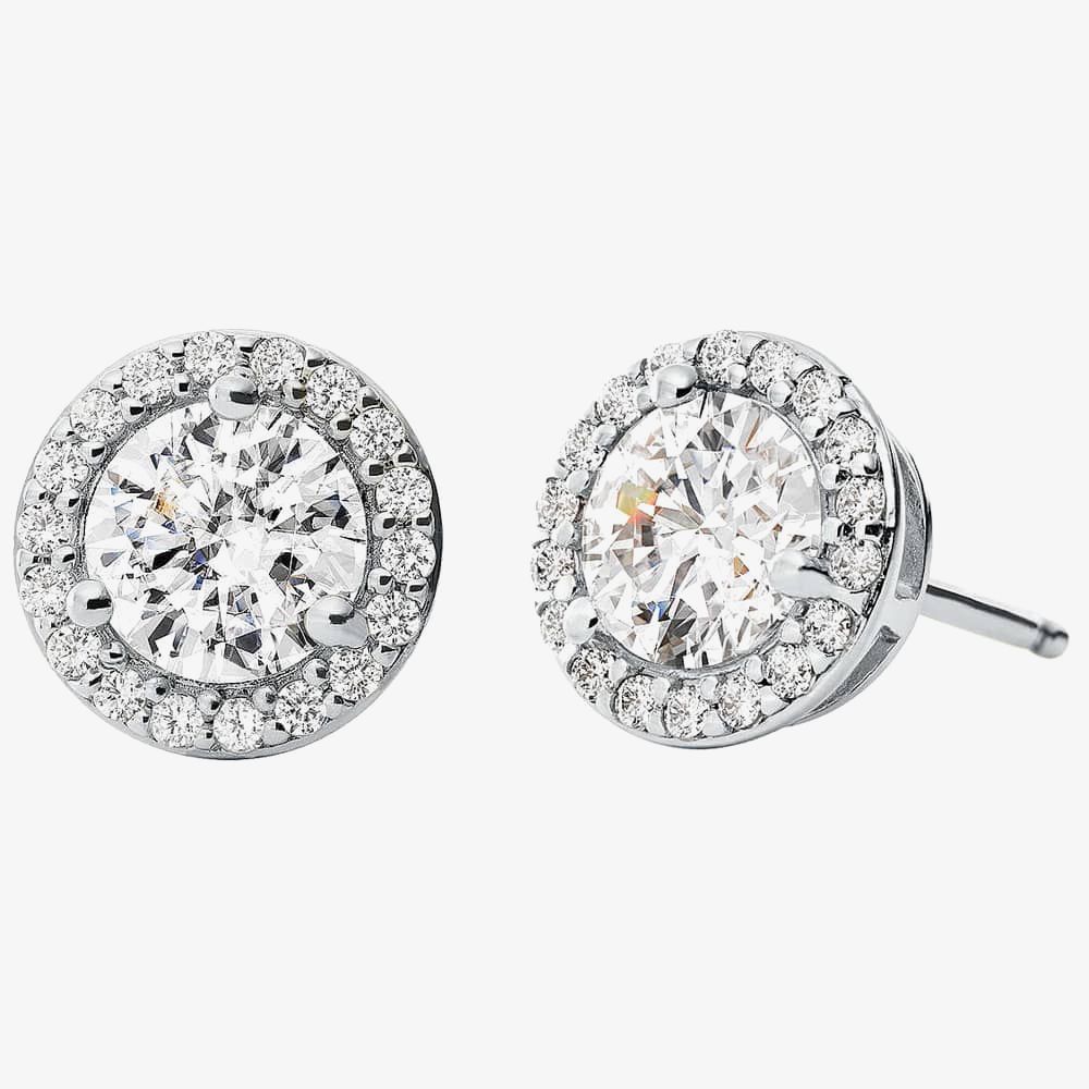 A pair of sterling silver stud earrings from Michael Kors. The earrings feature a round cubic zirconia stone surrounded by a halo of sparkling zirconia stones to form a fashionable cluster design.