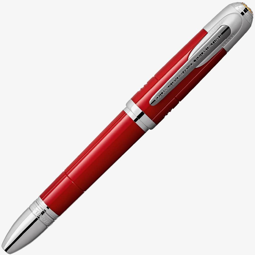 Montblanc Great Characters Enzo Ferrari Special Edition fountain pen, nib type M 132144. This pen is made from red precious resin. The cap top is crowned with a Montblanc emblem embedded in a metal grid on a yellow surface. There is a prancing horse on the back of the cap to symbolise the main logo for Ferrari cars. The clip-in metal is engraved with a famous quote by Enzo: "You cannot describe passion, you can only live it". The cone shows two important dates in the early career of Enzo Ferrari. The handcrafted Au 585 solid gold nib is engraved with the image of a Ferrari 250 GTO steering wheel and one of Enzo´s nicknames - "Pilota".