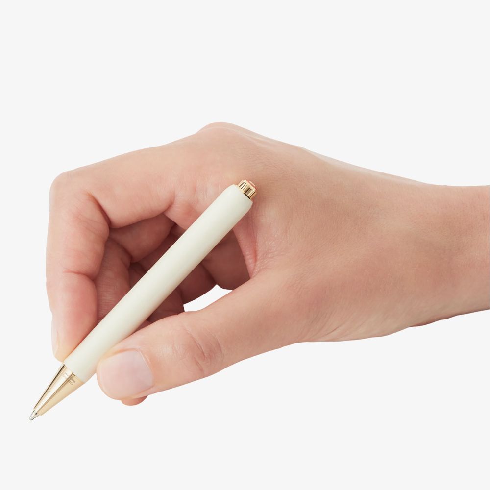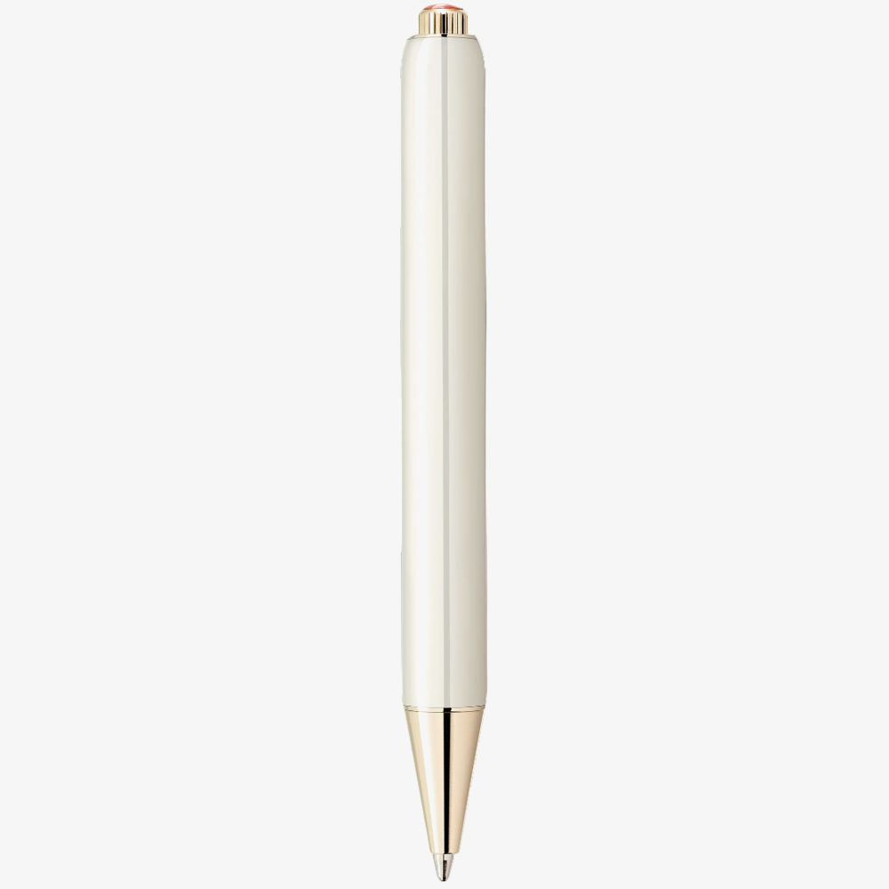 Montblanc Heritage Rouge et Noir Baby Special Edition Ivory Ballpoint Pen 128123 is delicately created in ivory-coloured precious lacquer with signature gold-coated fittings, crowned by a Montblanc emblem in precious resin surrounded by the coral hue of the Montblanc Rouge et Noir collection. Writing Mode: Ballpoint Pen. Dimensions: 99 x 9.6mm. Weight: 24.88g.