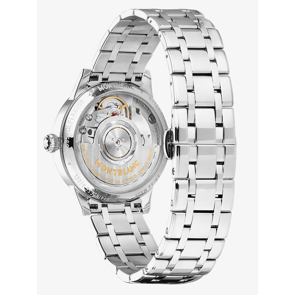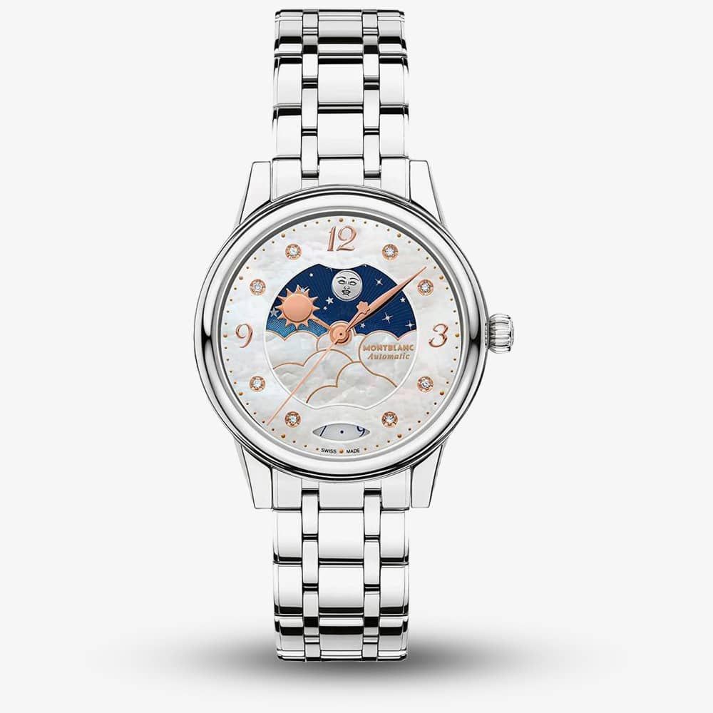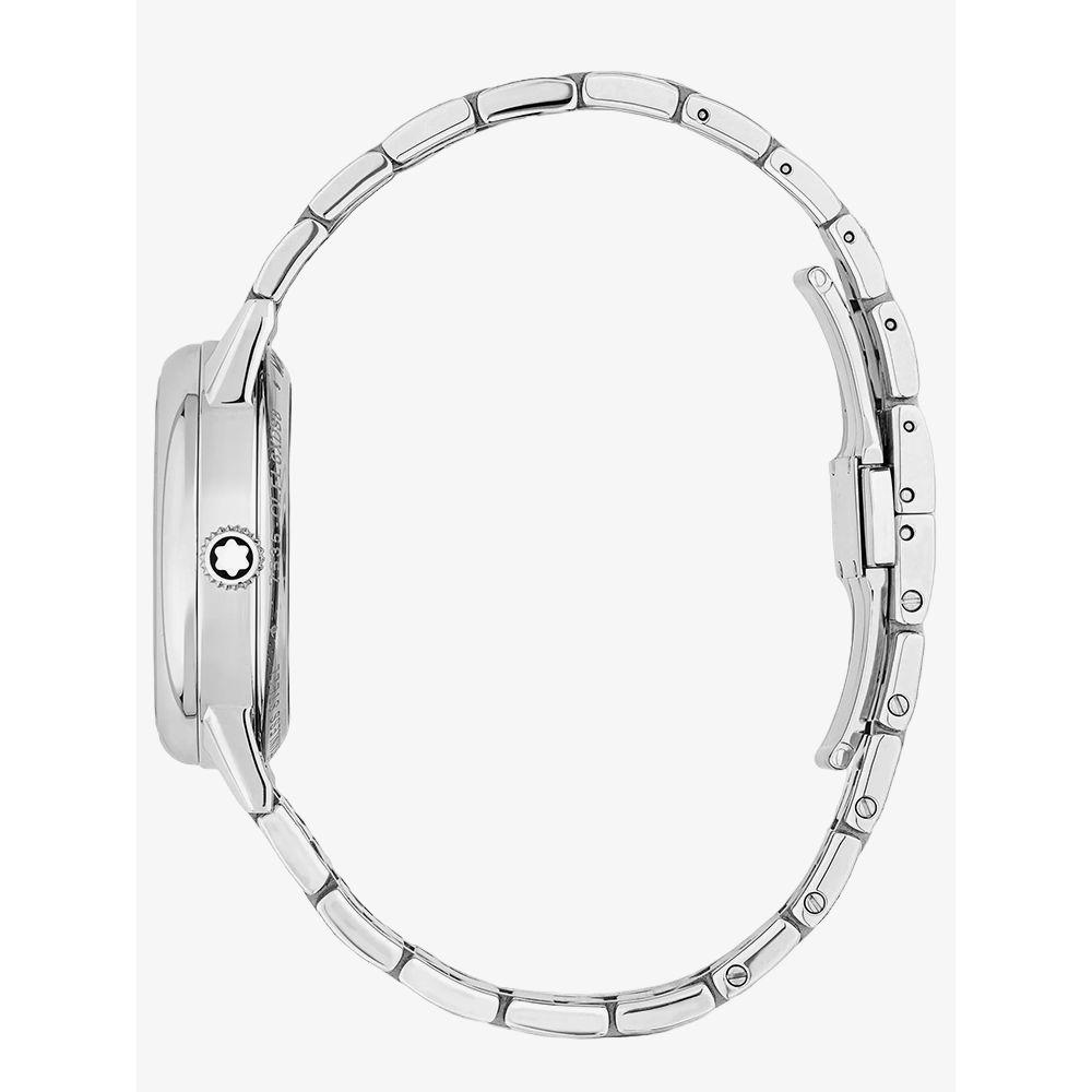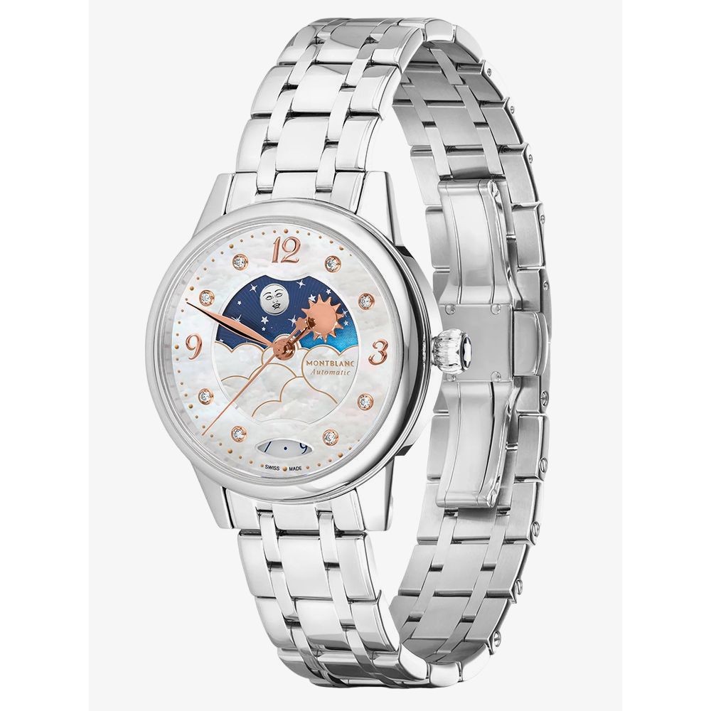 The Montblanc 129757 watch combines a 29mm round shaped stainless steel case and silver stainless steel bracelet with a push button deployment clasp. It has a mother of pearl analogue dial that features a moonphase with a date display which is protected beneath scratch resistant sapphire crystal glass. Power is generated by the automatic movement and has a power reserve of 56 hours. This model also has a water resistance of up to 30 metres.