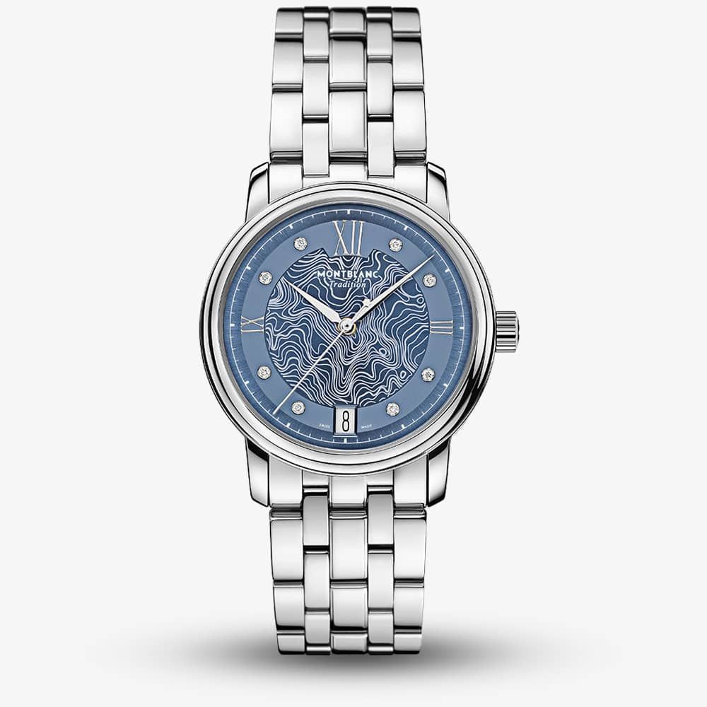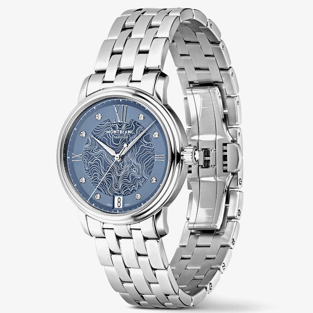 Introducing the Montblanc Automatic Date 32mm watch. This watch is built on a stainless-steel strap and has a 32mm sized case. The dial is truly the stand out part of this watch, with its striking blue colour with a wave centred pattern and diamond hour markers this truly is a stand out piece that will look good in casual or dress wear.
