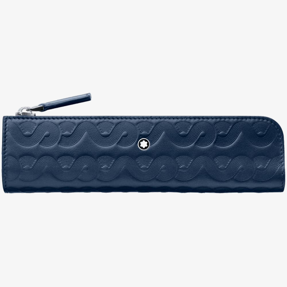 Montblanc Meisterstuck pen case 128635 is designed specifically for ballpoint and fountain pens in the Around the World in Eighty Days collection. It is made from blue leather, fastens using a zip, and set with the brands signature motif.