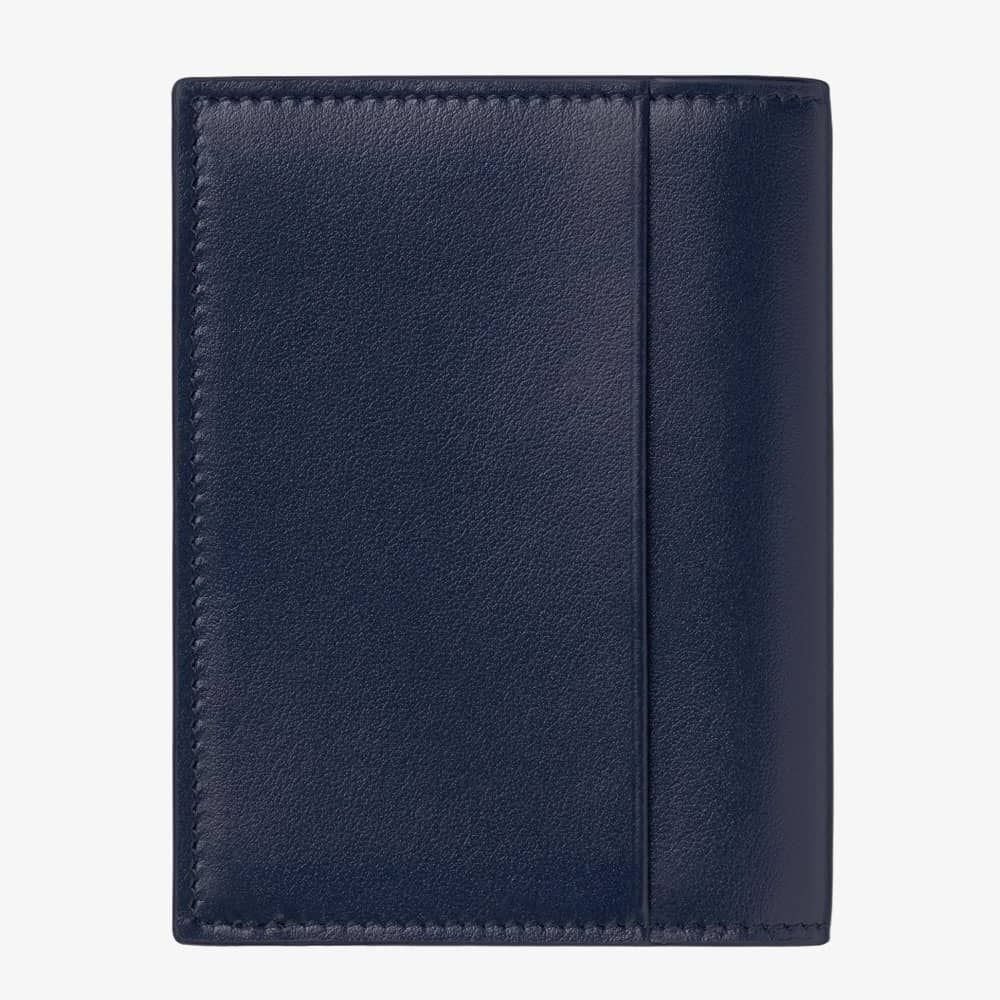 A Montblanc Meisterstuck cardholder is crafted from leather. Featuring a dedicated compartment for business cards and thoughtfully designed slots to house up to four credit cards, this accessory ensures you're always prepared. Wrapped in ink blue leather, it boasts the iconic Montblanc emblem gracing its front, a mark of distinction that sets you apart. The interior, lined with luxurious jacquard material, and the flapover wallet opening style add an extra layer of sophistication to this essential piece.