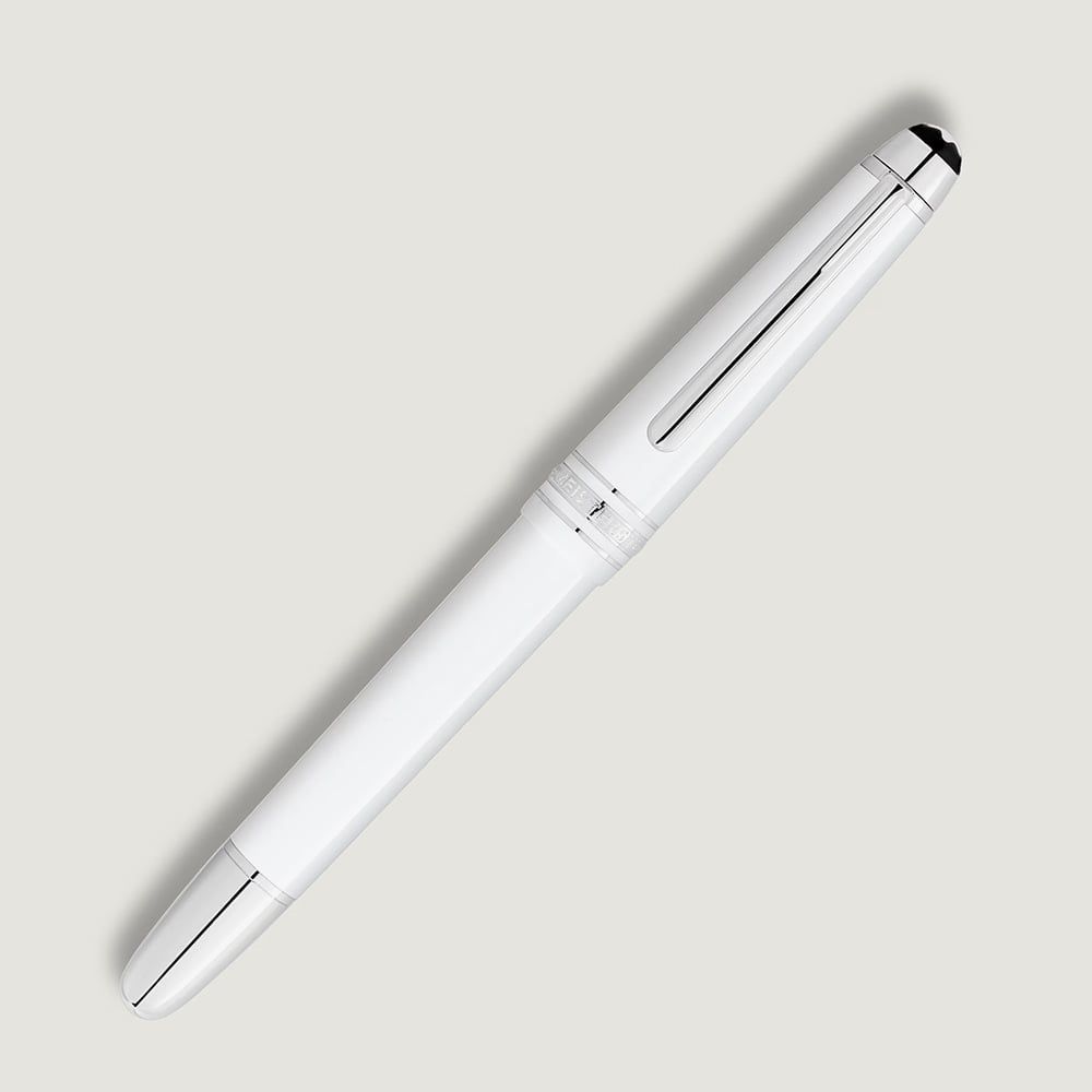 The Meisterstück Classique Fountain Pen in white precious resin exudes timeless sophistication, accentuated by platinum-coated fittings and the signature Montblanc white emblem on the cap top. Its handcrafted Au 585 solid gold nib with rhodium plating ensures a smooth, luxurious writing experience, making this pen a true icon of design and craftsmanship.