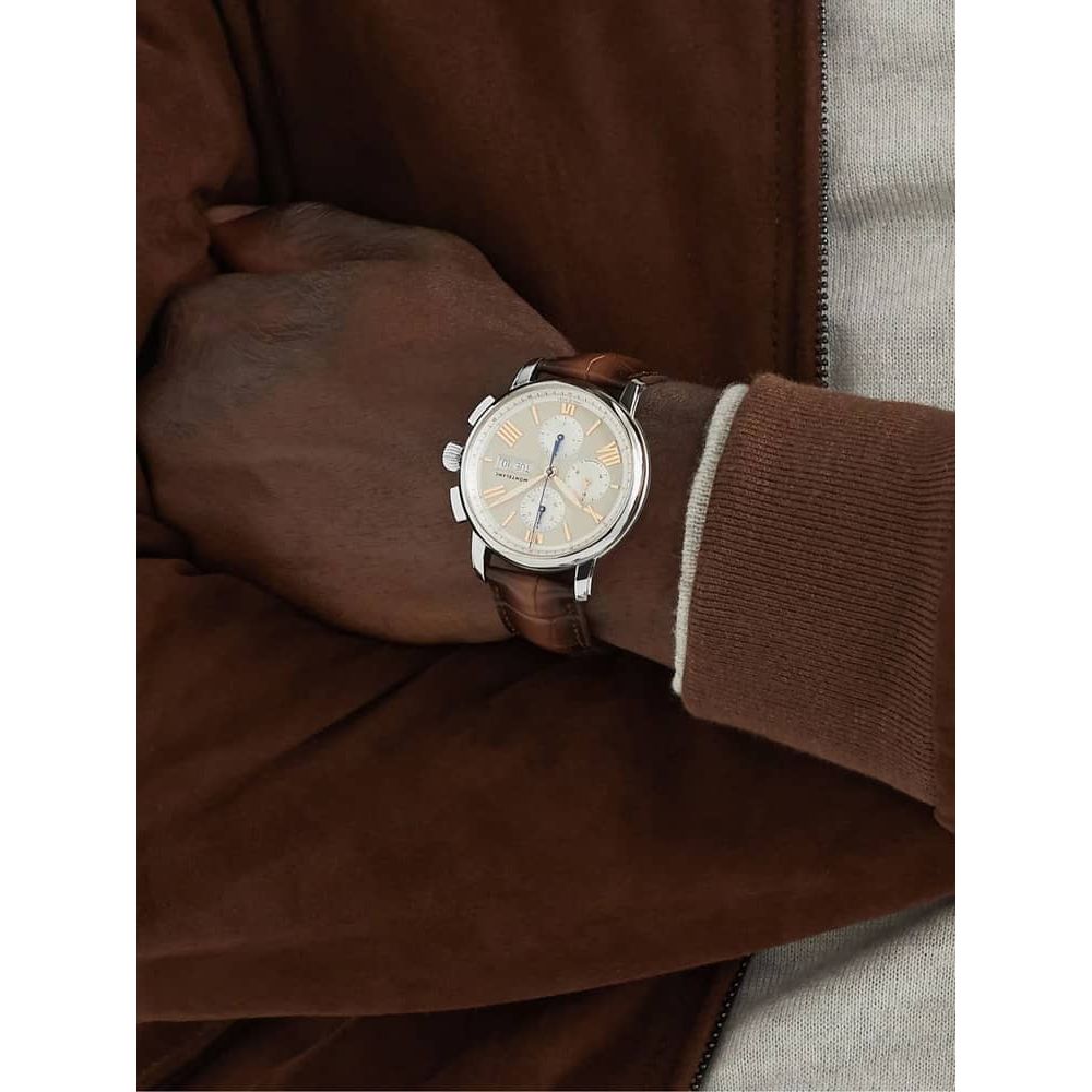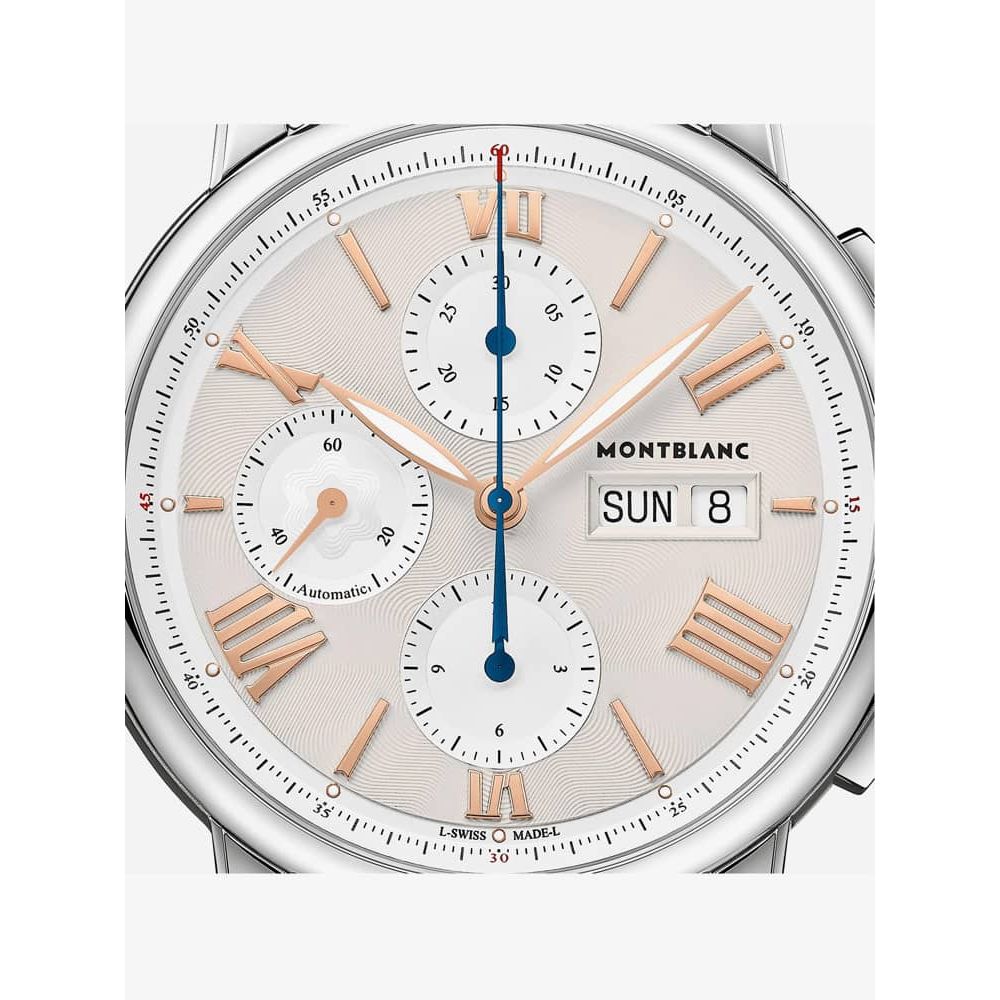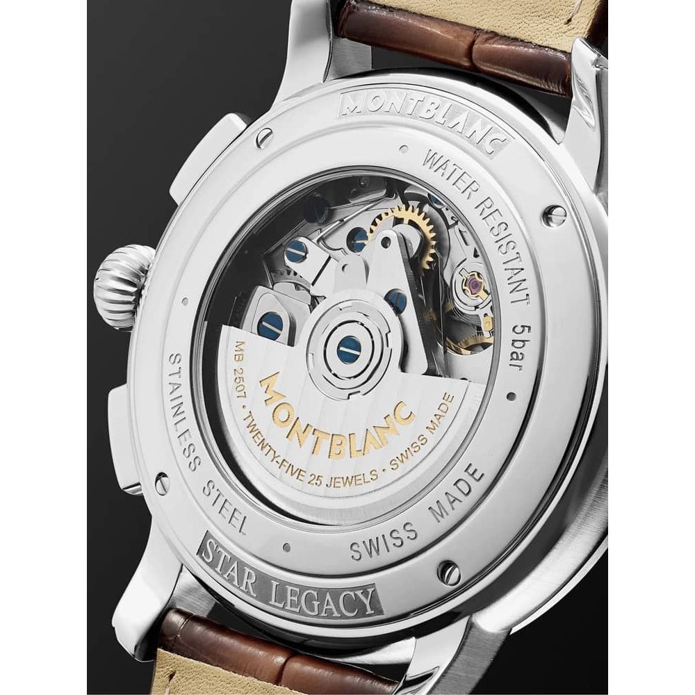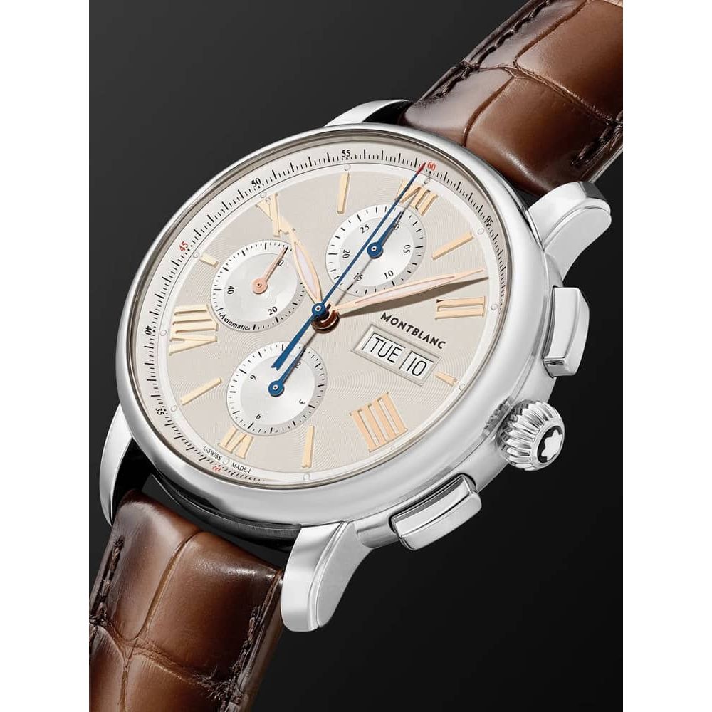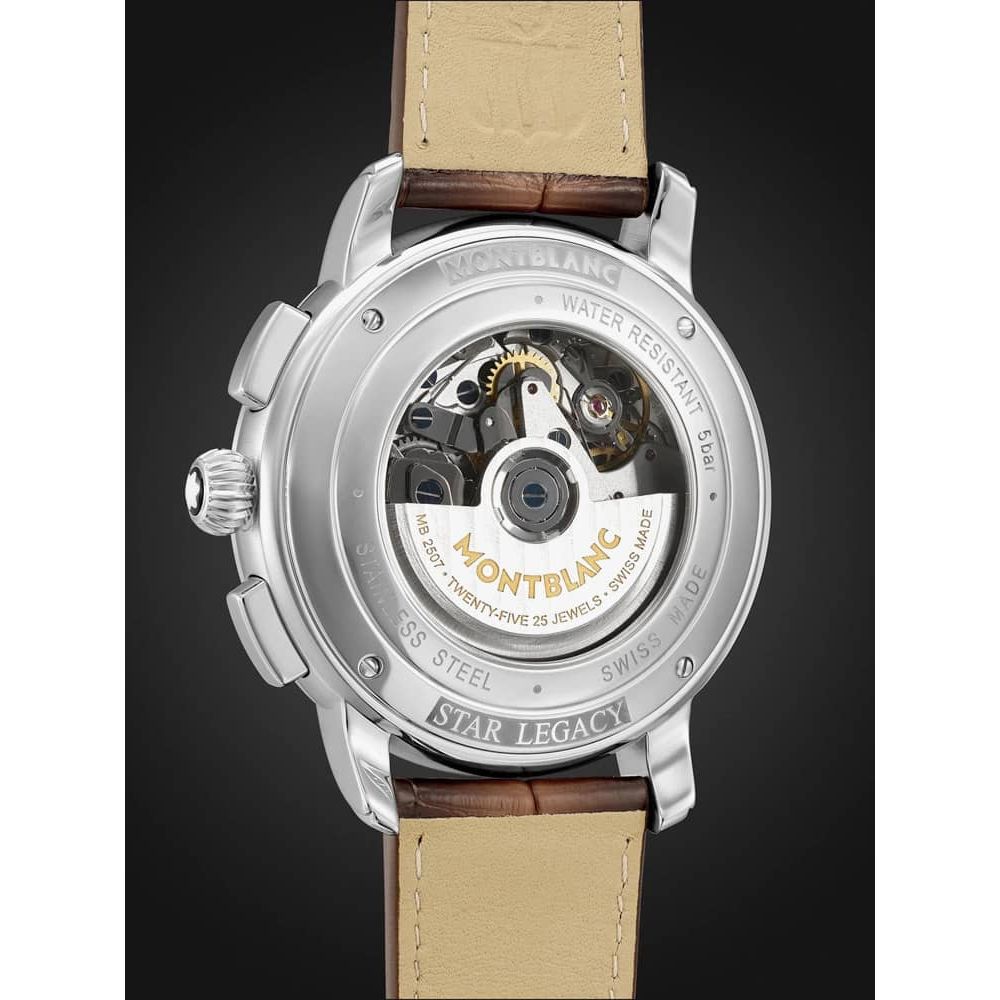 The Montblanc 126080 Star Legacy watch takes its inspiration from Minerva’s heritage and the company’s pocket watches that were made during the late 19th century and early 20th century. It combines a 43mm round shaped stainless steel case and brown alligator leather strap with a traditional buckle. It has a cream analogue dial with 18k rose gold luminescent hands, a day/date display, and chronograph sub-dials, all of which is protected beneath scratch resistant sapphire crystal glass. Power is generated by the Calibre MB 25.07 automatic movement with 25 jewels and a power reserve of up to 48 hours. This model also has a sapphire crystal case back and a water resistance of up to 50 metres.