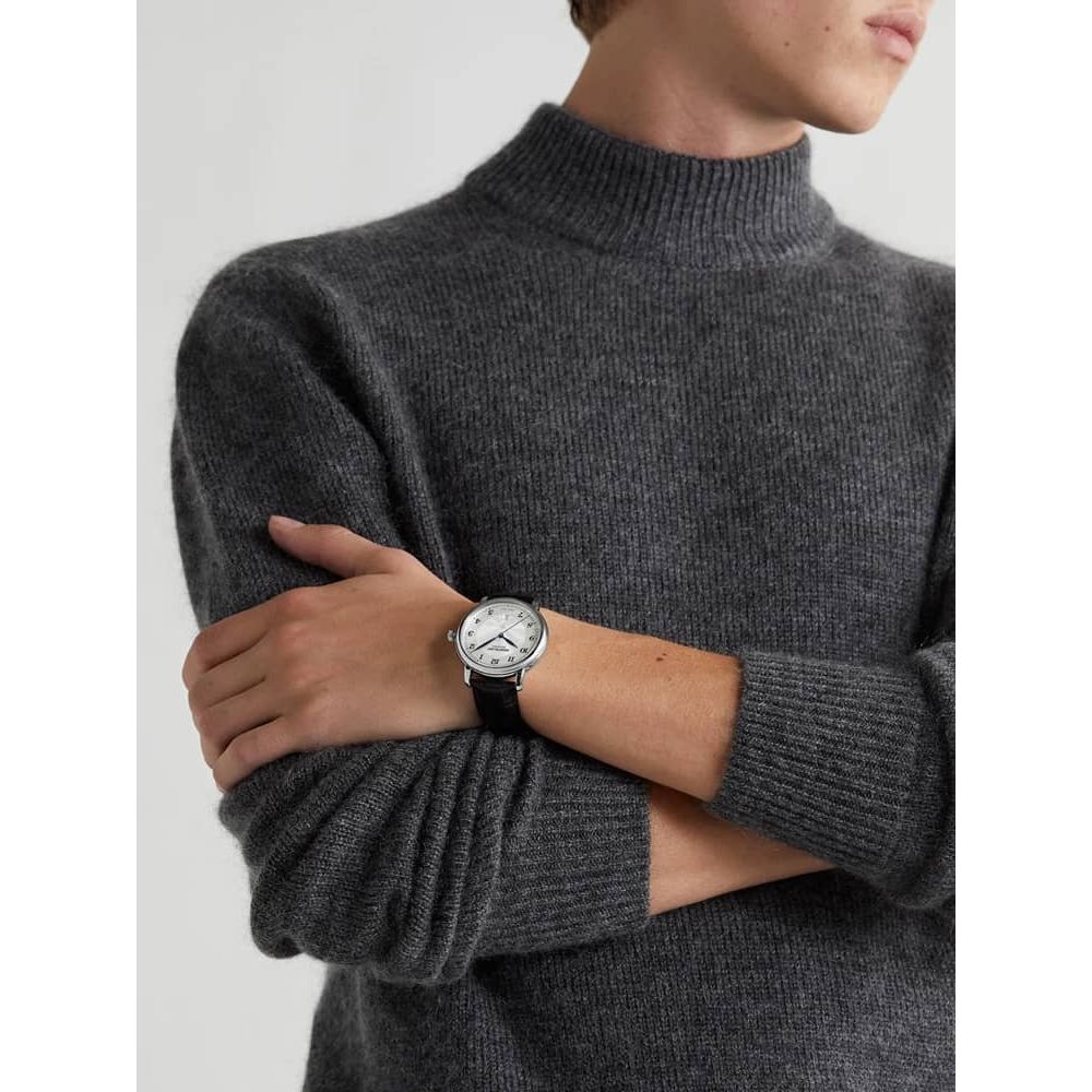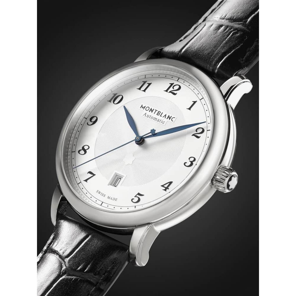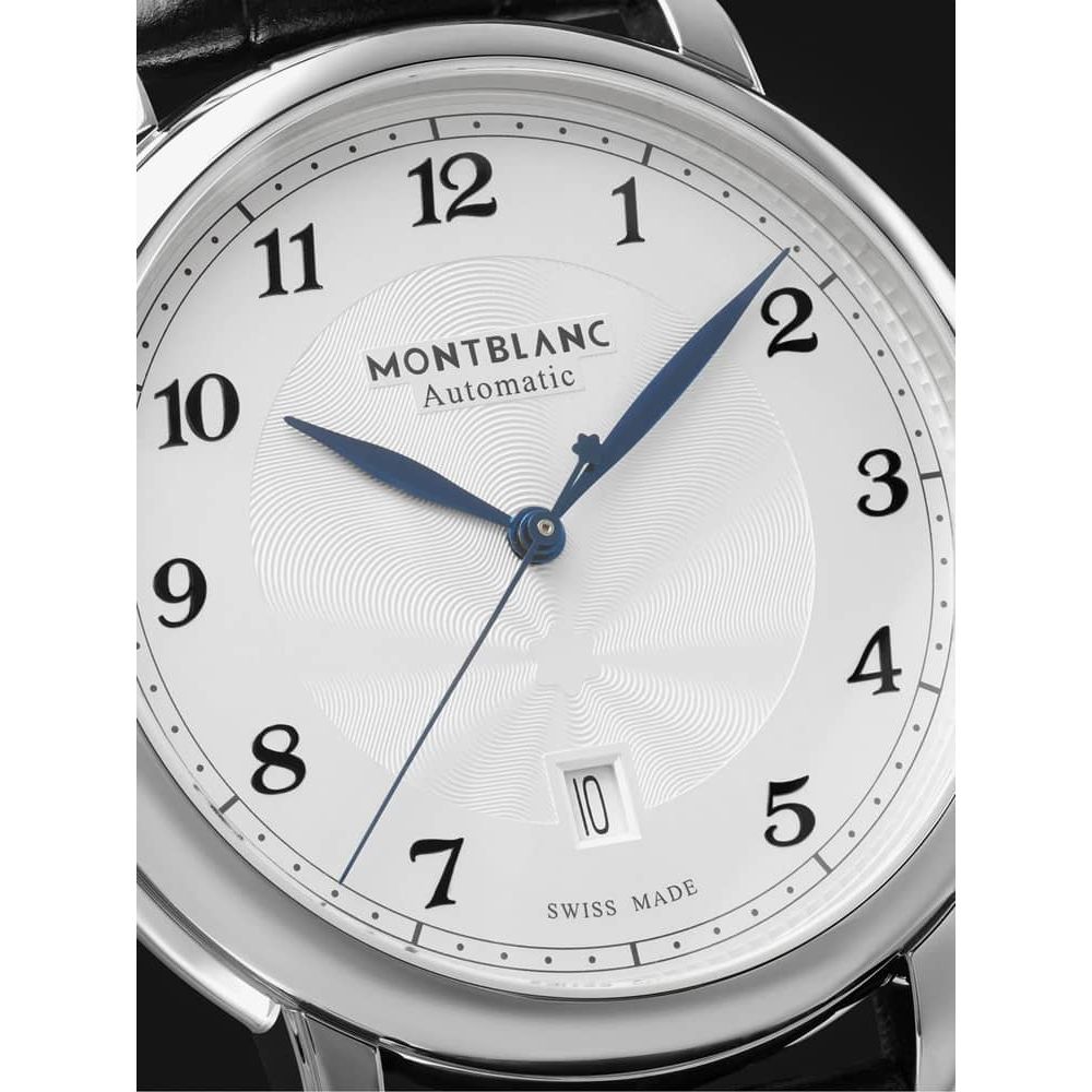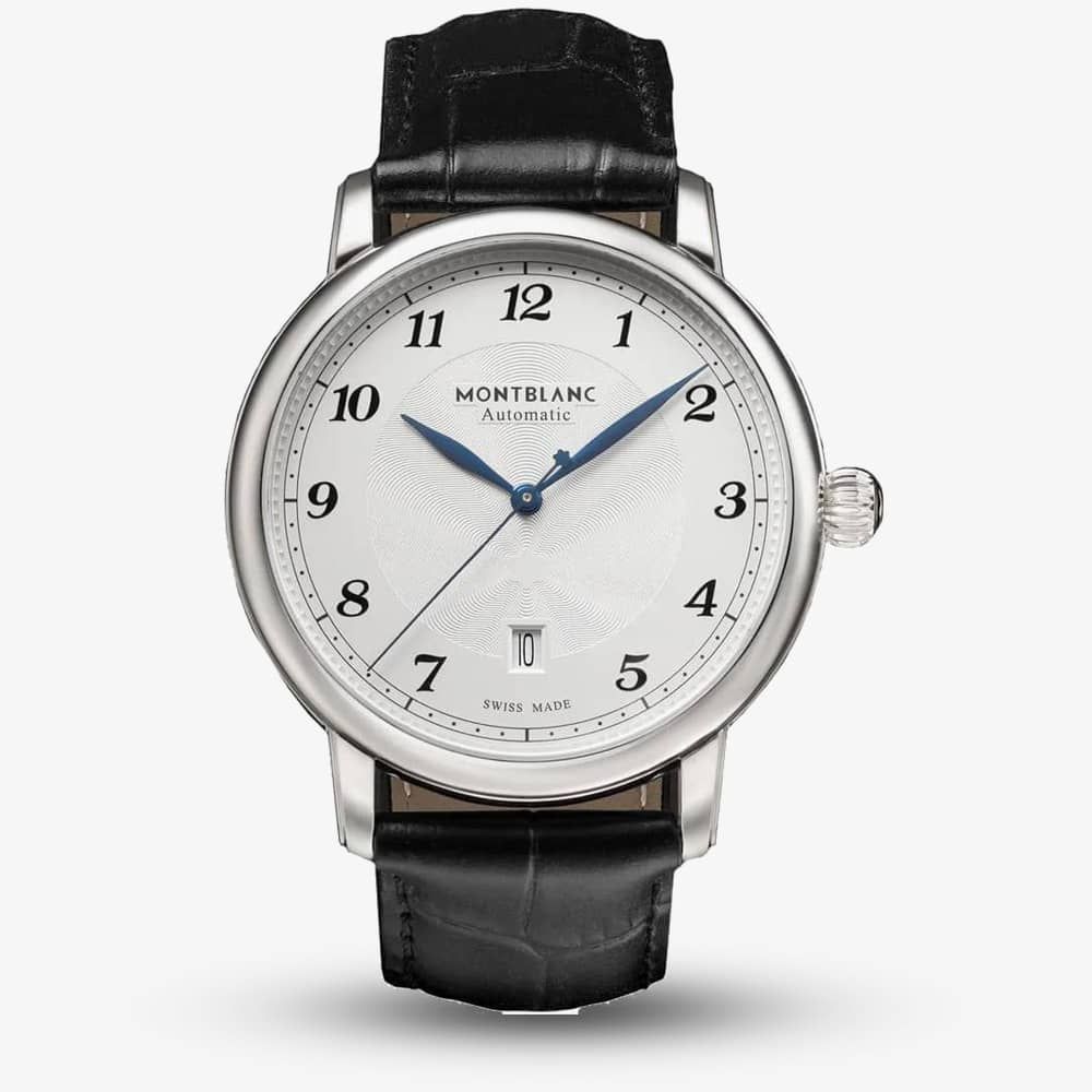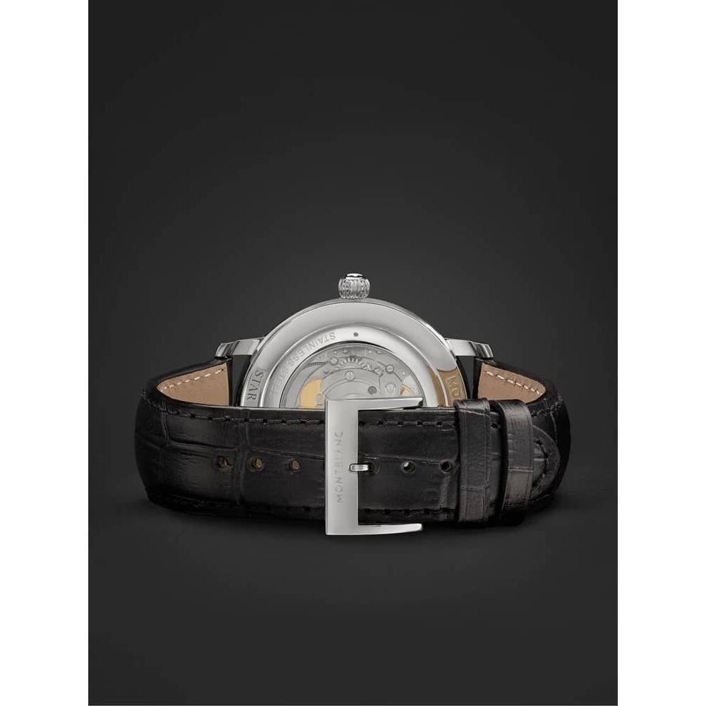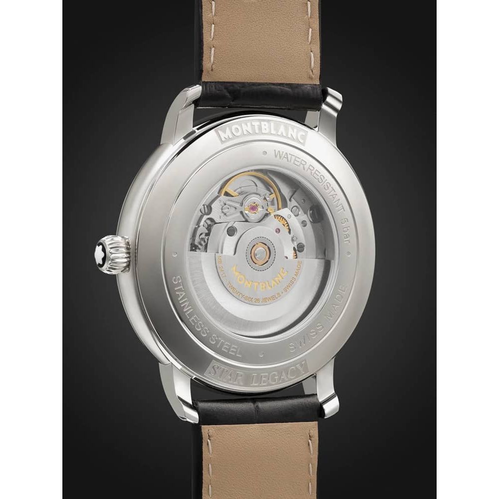 The Montblanc 128681 Star Legacy watch takes its inspiration from Minerva’s heritage and the company’s pocket watches that were made during the late 19th century and early 20th century. It combines a 42mm round shaped stainless steel case and black leather strap with a traditional buckle. It has a white analogue dial with black Arabic numerals and a date display which is protected beneath scratch resistant sapphire crystal glass. Power is generated by the Swiss-made calibre MB 24.17 automatic movement with 26 jewels and a power reserve of up to 38 hours. This model also has a sapphire crystal case back and a water resistance of up to 50 metres.