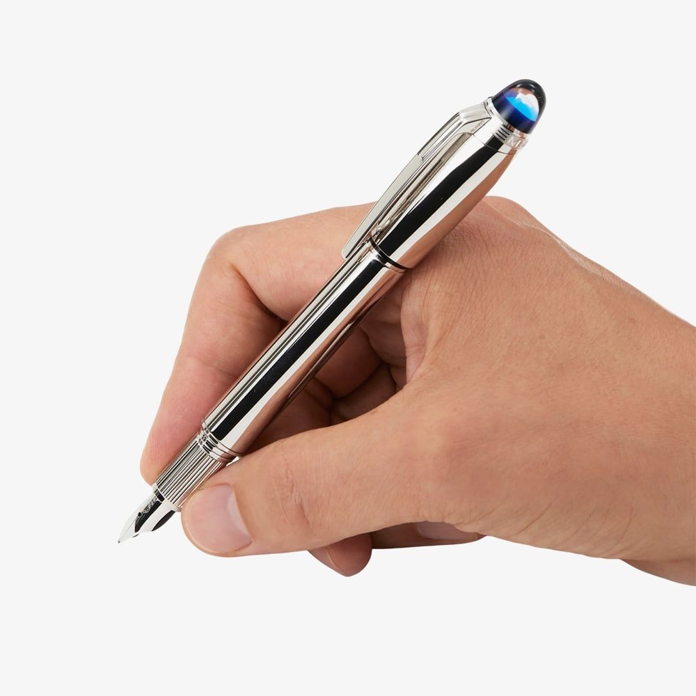 The stunning Starwalker Metal Fountain pen is a celebration of the immense emotion described by all space travellers when seeing our blue planet floating in the vast expanse of space. The unique Starwalker features a blue translucent dome beneath a Montblanc emblem. The pen is finished with platinum-coated cap, fittings, barrel and a rhodium plated Au585/14ct gold nib.