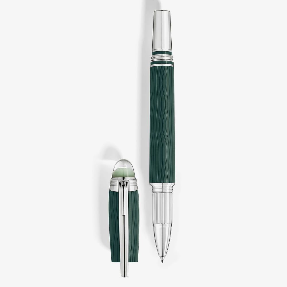 StarWalker PolarGreen captures the magic of the Northern Lights. A glowing transparent resin dome evokes the aurora’s dance, while the dark green precious resin cap and barrel feature a wave pattern that reflects their spectral sheen. The matte finish enhances the subtle reflections, and platinum fittings add a refined, elegant touch.