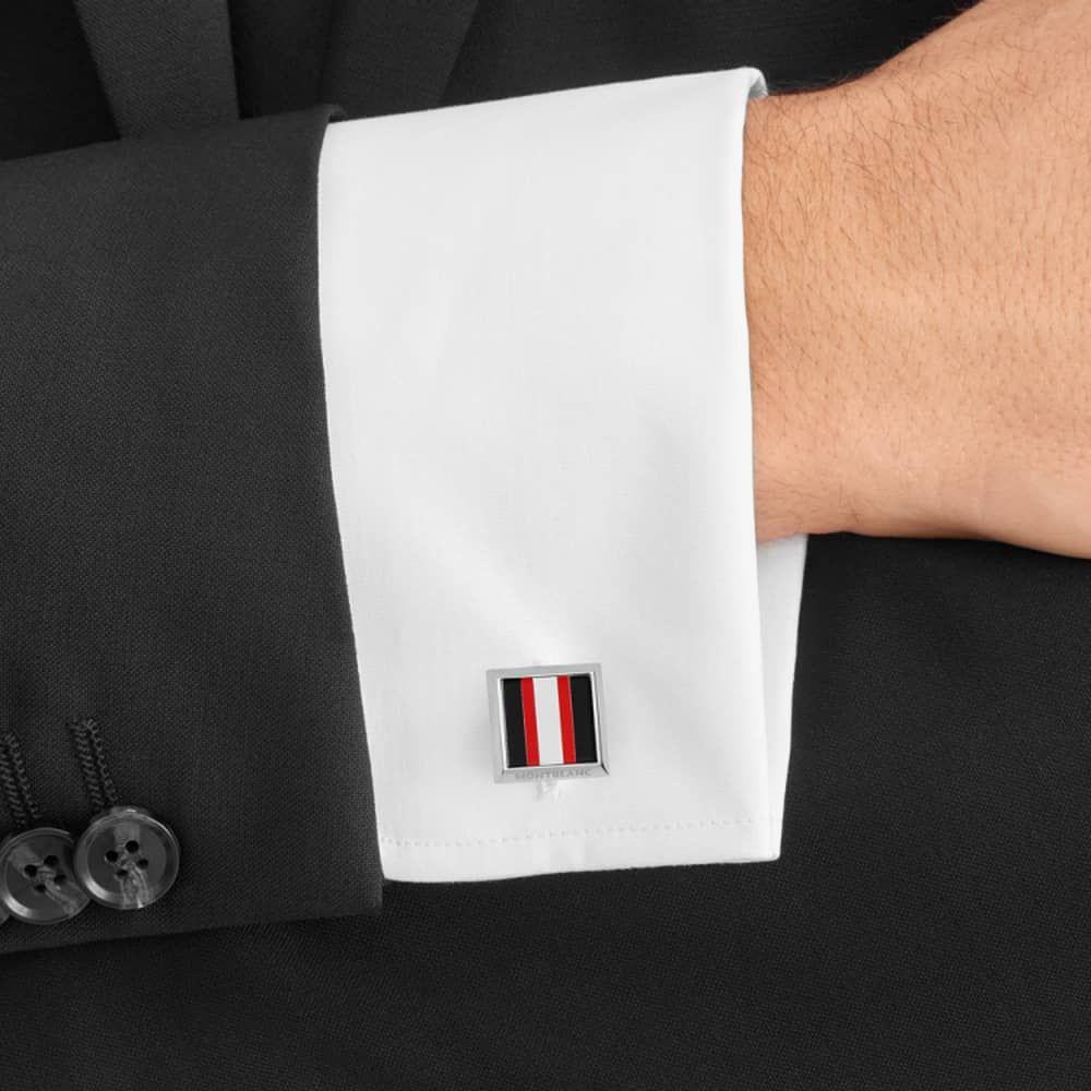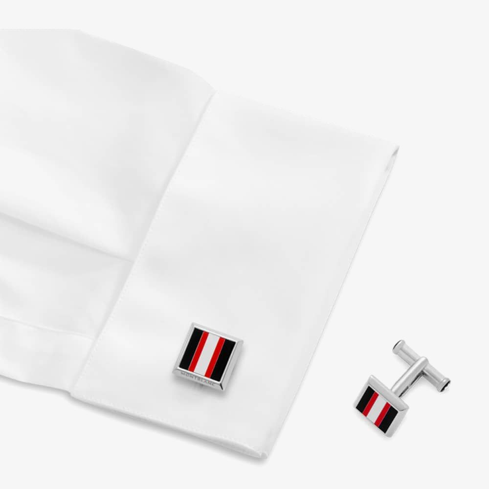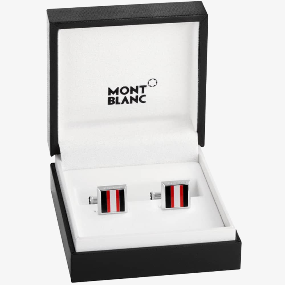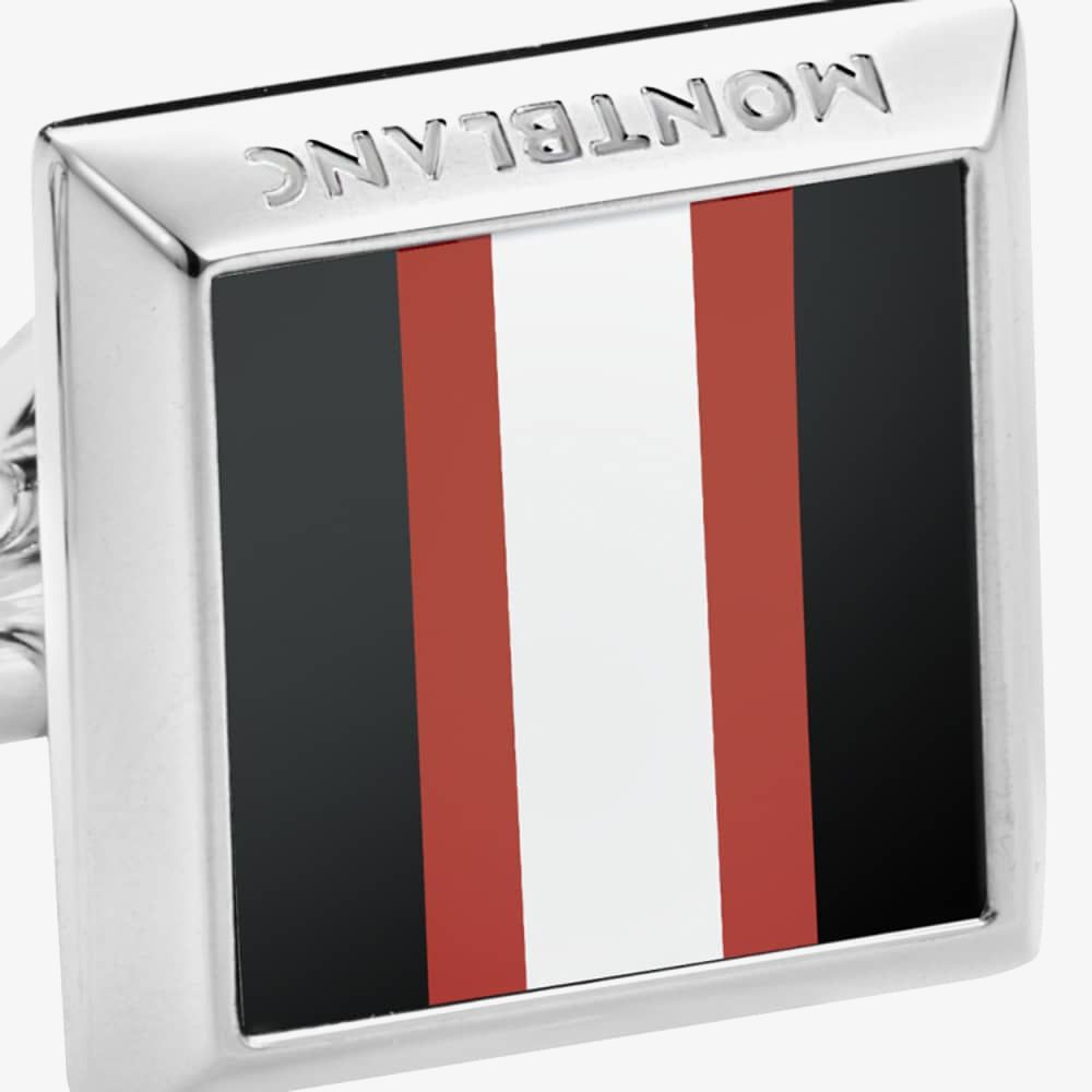 This sporty pair of stainless steel cufflinks from Montblanc features a racing theme centrepiece consisting of red, white and black stripes formed from lacquer. The pair also incorporate embossed ‘Montblanc’ detailing around the edges and the brands signature star emblem.