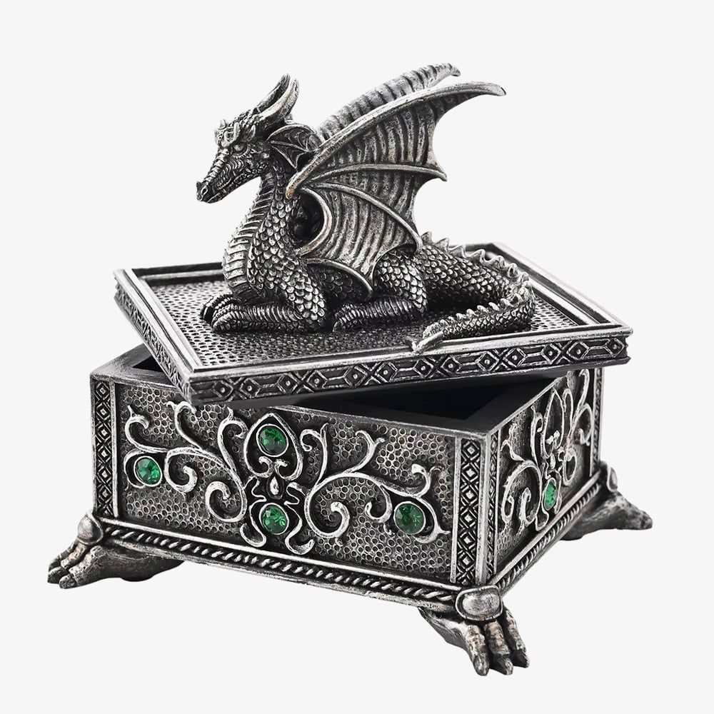 This striking trinket box from the Mystic Legends collection by Juliana, features a silver-toned design adorned with green crystals, crafted from high-quality resin for intricate detailing. A perfect keepsake for collectors and fans of mystical, gothic-inspired décor.
