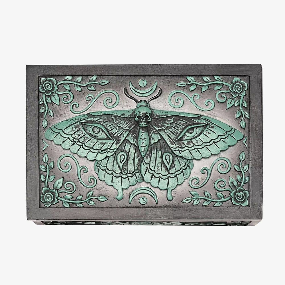 Embrace the mystical charm of the Mystic Legends Gothic Moth Storage Box, featuring dark green and black tones and intricate floral and butterfly carvings. This captivating piece offers a stylish storage solution while adding a touch of gothic elegance to any room, making it perfect for safeguarding treasured keepsakes.