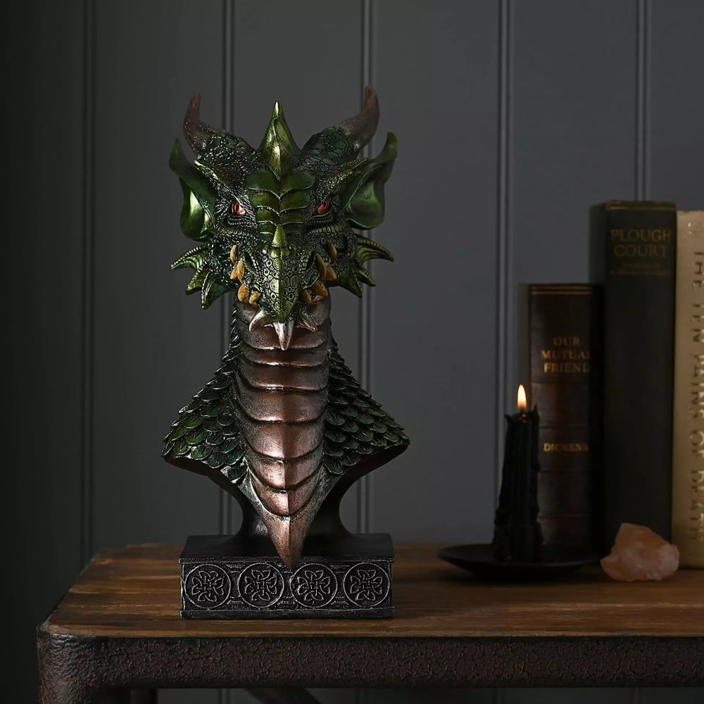 The Green Dragon Bust on a Plinth from the Mystic Legends Collection by Juliana Collection is a striking and majestic piece, featuring rich green and bronze hues with a metallic effect finish. Made from high-quality resin, it boasts intricate detailing that captures the essence of fantasy and mysticism. Perfect for those drawn to gothic and mythical aesthetics.