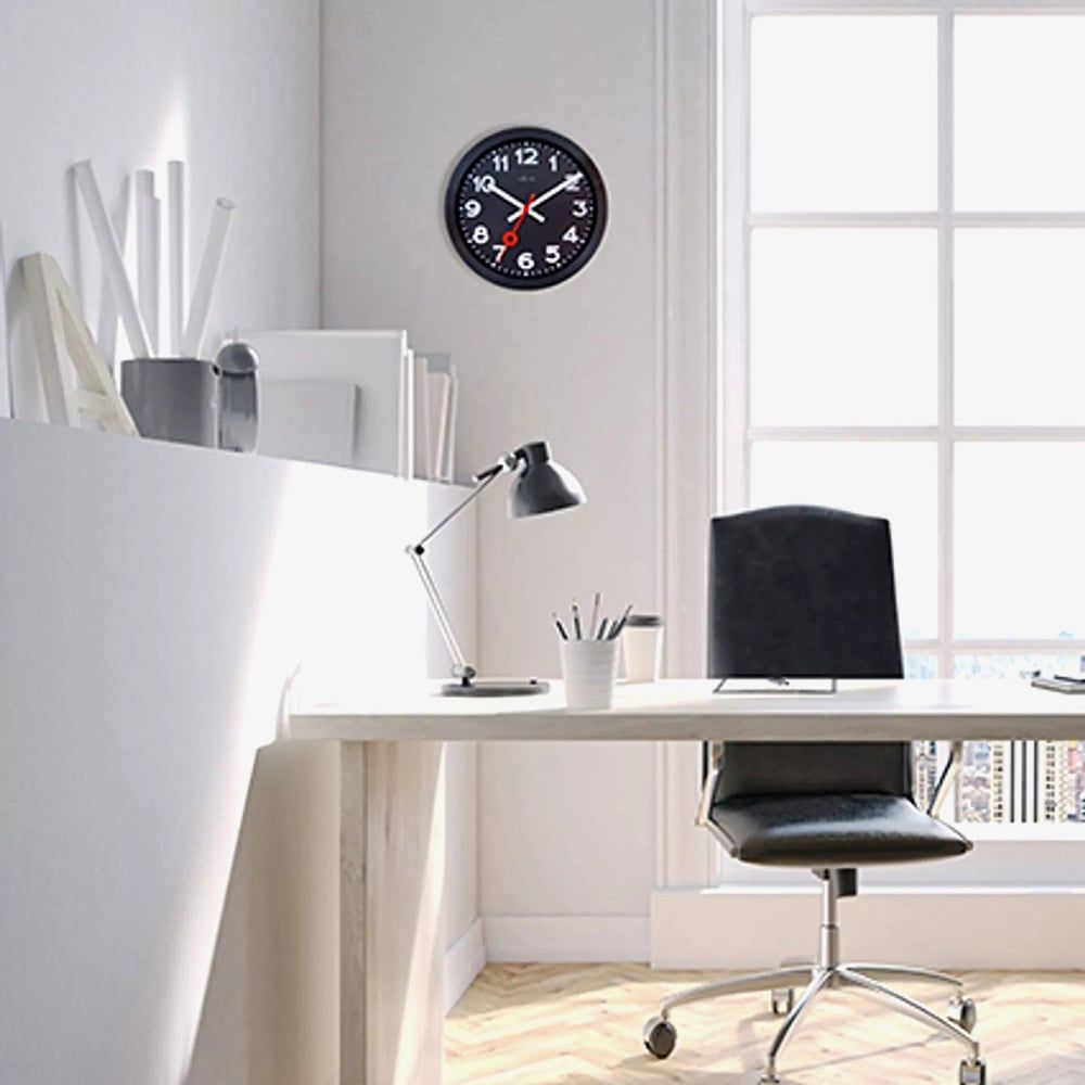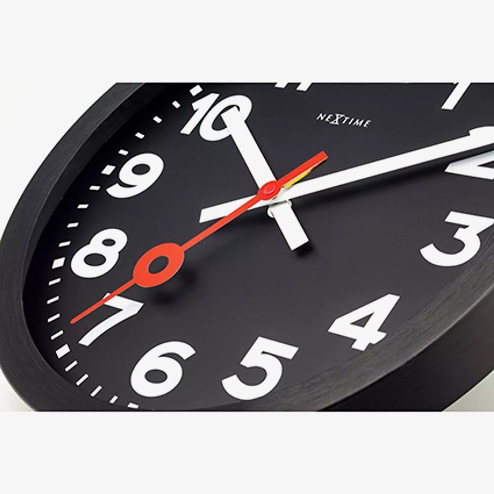 The NeXtime Station All Black Aluminium Wall Clock is a striking timepiece that embodies modern minimalism and precision craftsmanship. Its brushed anodised aluminium frame complements the sleek black dial with clear Arabic numerals, creating a bold yet understated look. The vibrant red second hand, accented with a signature circle detail, adds a refined touch of contrast. With its silent movement and contemporary design, this clock makes a sophisticated statement in any space.