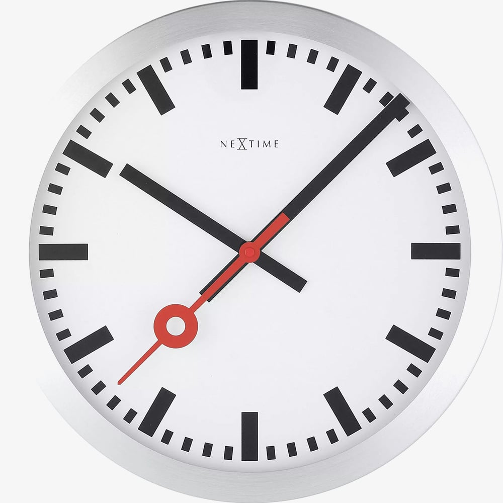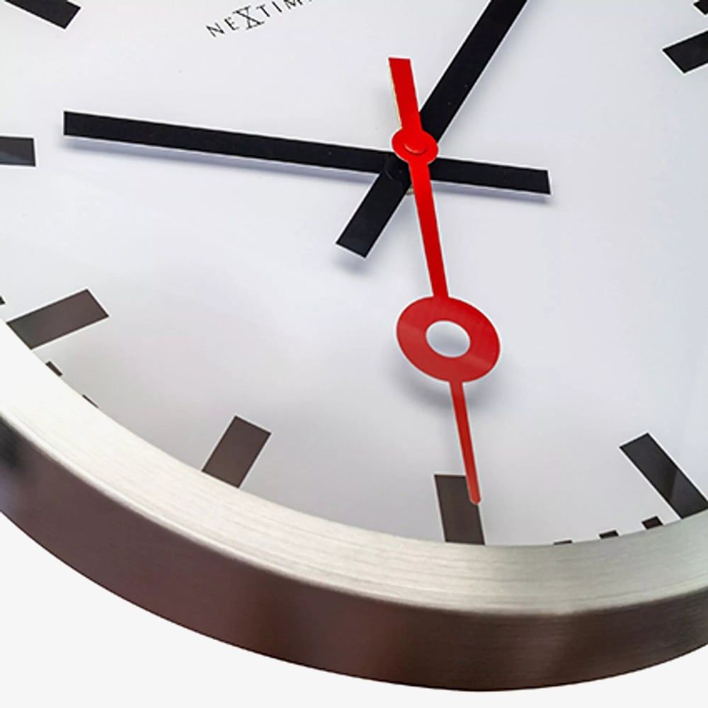The NeXtime Station White Aluminium Wall Clock is a striking timepiece that embodies modern minimalism and precision craftsmanship. Its brushed anodised aluminium frame complements the sleek white dial with clear Arabic numerals, creating a bold yet understated look. The vibrant red second hand, accented with a signature circle detail, adds a refined touch of contrast. With its silent movement and contemporary design, this clock makes a sophisticated statement in any space.