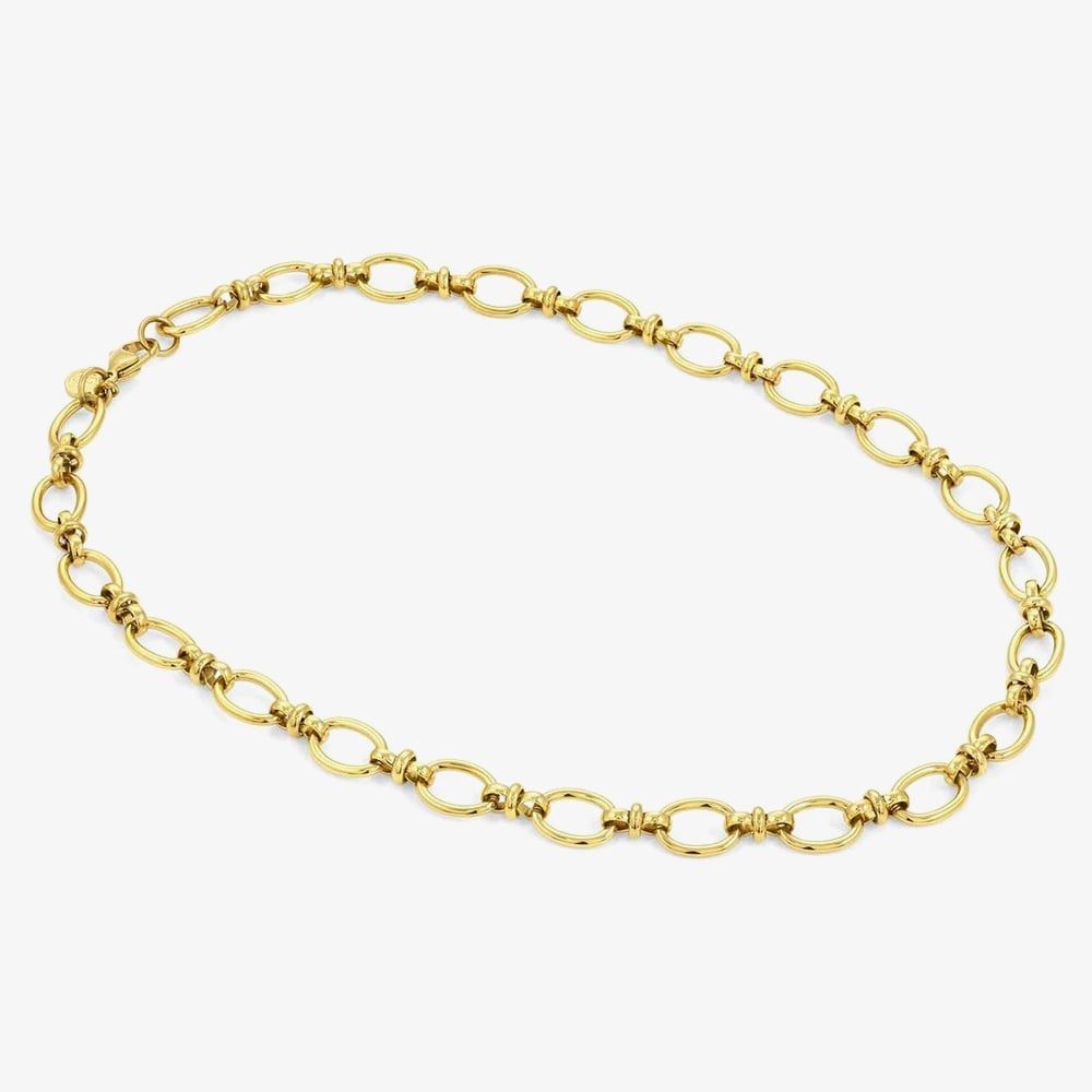 The Nomination Affinity Gold Plated Stainless Steel Oval Link Necklace 028604/001 is delicately crafted from stainless steel with gold PVD plating combining multiple oval hoop links with smaller joining section. Perfect for day or night, this necklace measures 46cm in length creating this minimal yet bold look.