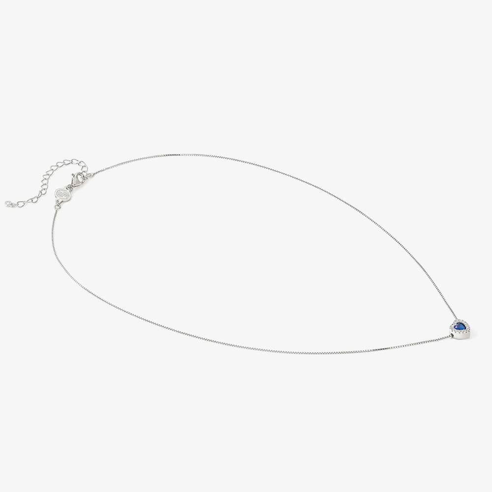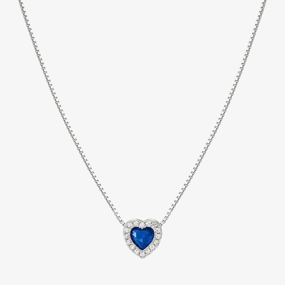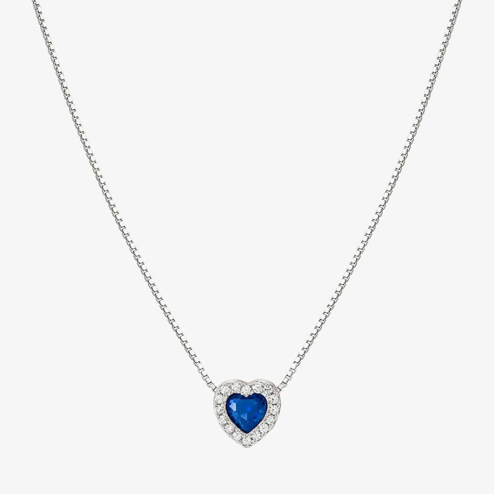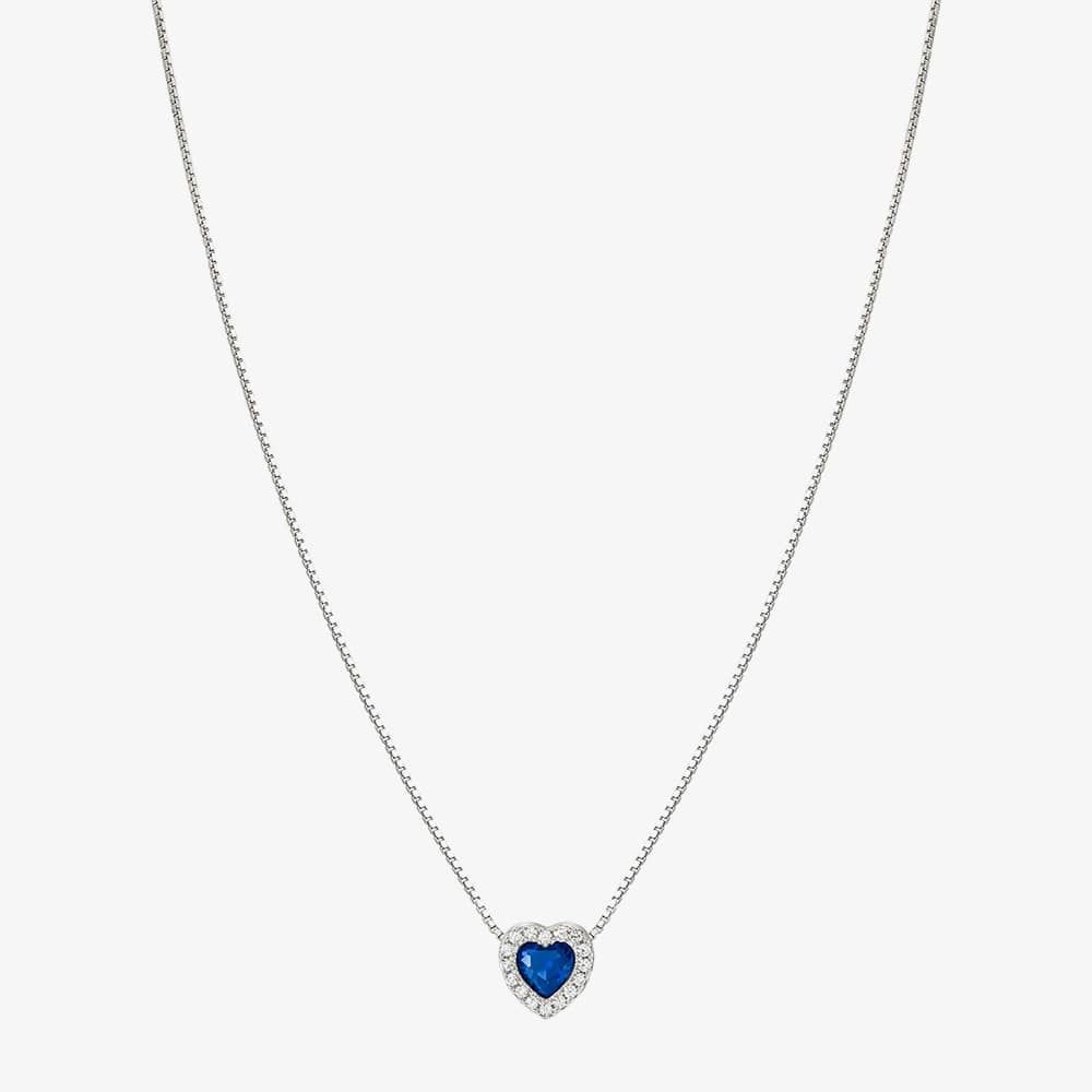 This necklace features a stunning white rhodium-treated finish, adding a touch of timeless charm. The centrepiece of this accessory is a captivating blue cubic zirconia heart symbol, beautifully complemented by a delicate halo of glistening white cubic zirconia stones. The blue and brilliant white cubic zirconia stones create a striking and romantic aesthetic, making it an ideal choice for casual and formal occasions.