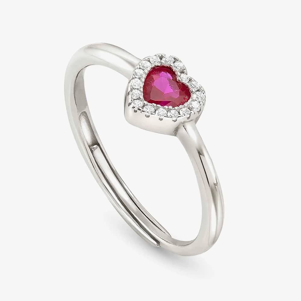 The ring boasts a lustrous white rhodium-treated finish, imparting a timeless and polished look. At its centre lies a graceful red cubic zirconia heart symbol, exuding charm, and femininity. Accentuating this radiant centrepiece is a delicate halo of shimmering white cubic zirconia stones. This ring is a perfect expression of love and style.