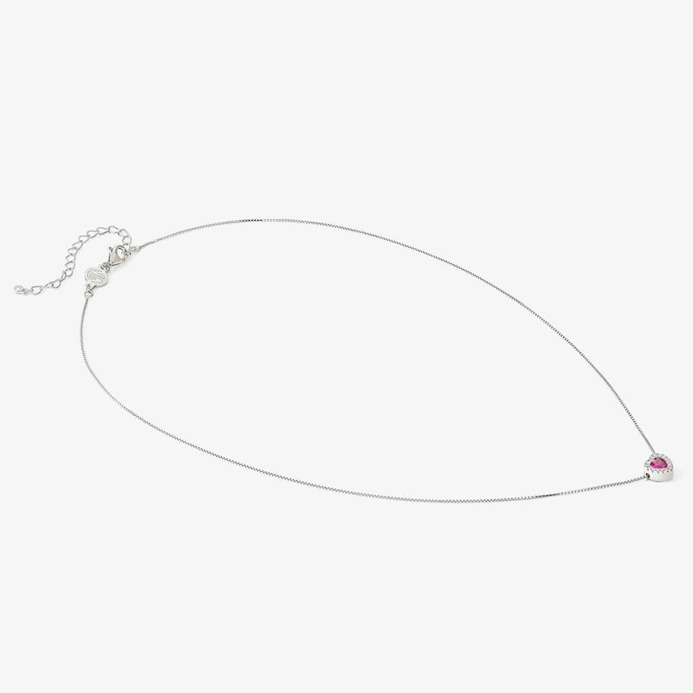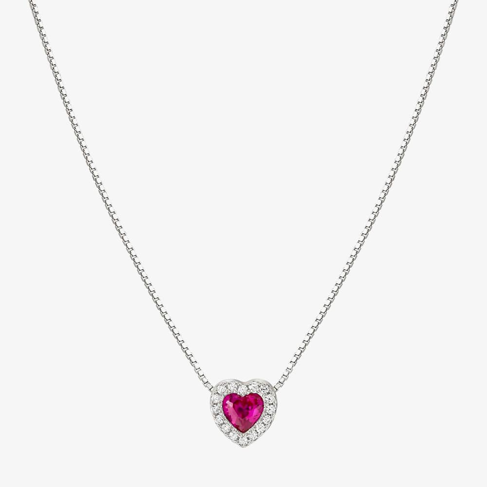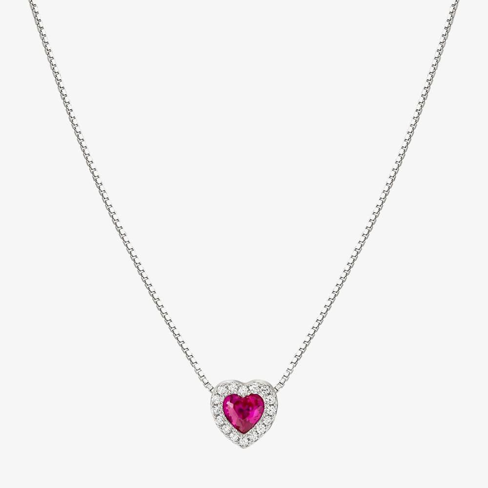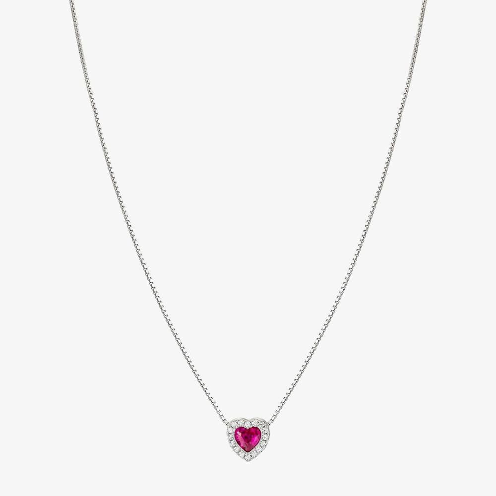 This necklace features a stunning white rhodium-treated finish, adding a touch of timeless charm. The centrepiece of this accessory is a captivating red cubic zirconia heart symbol, beautifully complemented by a delicate halo of glistening white cubic zirconia stones. The vibrant red and brilliant white cubic zirconia stones create a striking and romantic aesthetic, making it an ideal choice for casual and formal occasions.