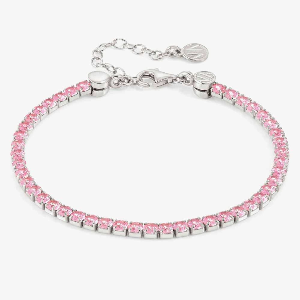 This sterling silver bracelet, elegantly enhanced with a white rhodium-treated finish, exudes a timeless sophistication. Adorned with sparkling pink cubic zirconia throughout, it adds a touch of vibrant charm and luxury.