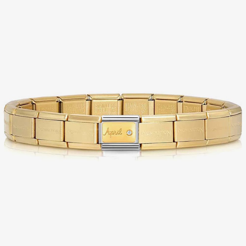 The Nomination CLASSIC Composable Plates April Clear Stone Charm 030519/04 features a bonded yellow gold plate with the engraving April & a clear stone which is set on a stainless-steel base.