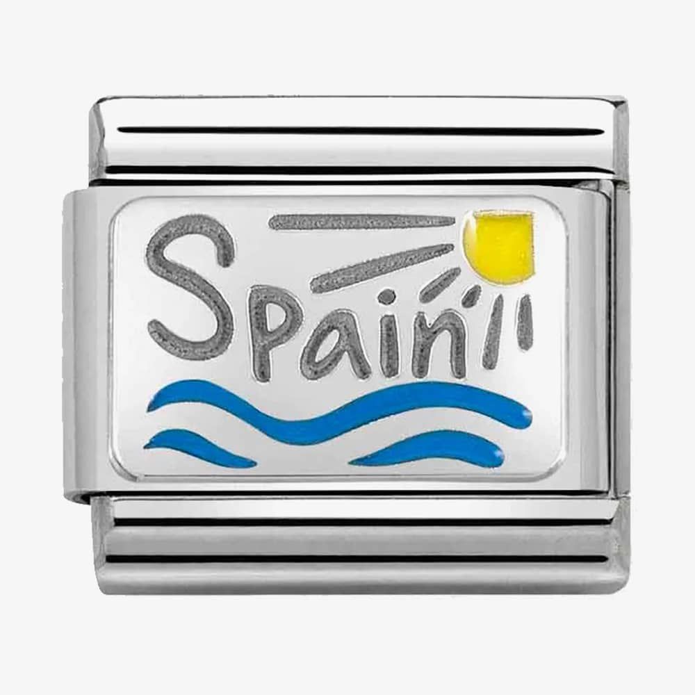 The Nomination Composable CLASSIC Symbols Colourful Spain Charm 330210/02 features a sterling silver plate with a colourful enamel sun and sea symbol with SPAIN text which is set on a stainless-steel base. A perfect addition to add to your COMPOSABLE bracelet to celebrate beautiful Spain.