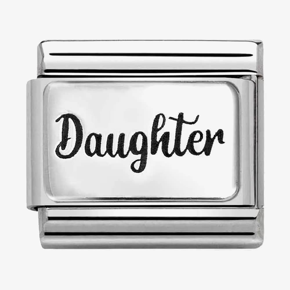 The Nomination Composable CLASSIC Plates Daughter Charm 330111/43 features a sterling silver plate with the text Daughter in fancy script which is set on a stainless-steel base. A perfect addition to add to your COMPOSABLE bracelet to celebrate your Daughter and let her know how much she is loved.