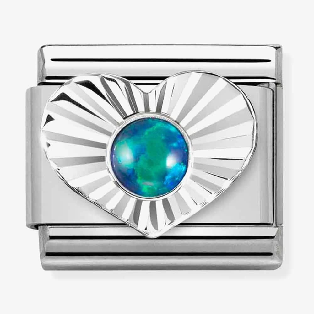 The Nomination CLASSIC Composable Green Opal Heart Charm 330508/26 features a round green opal stone adorned with a 925 sterling silver heart-shaped fluted bezel mounted on a stainless steel base.