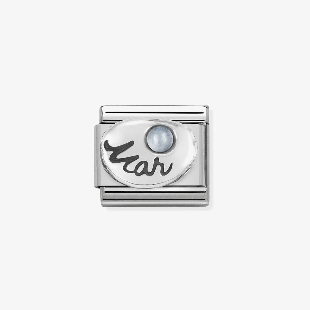 Celebrate your birth month with this Nomination bracelet composed of 18 CLASSIC steel base links and a central link featuring an Aquamarine stone with the word Mar in black enamel.