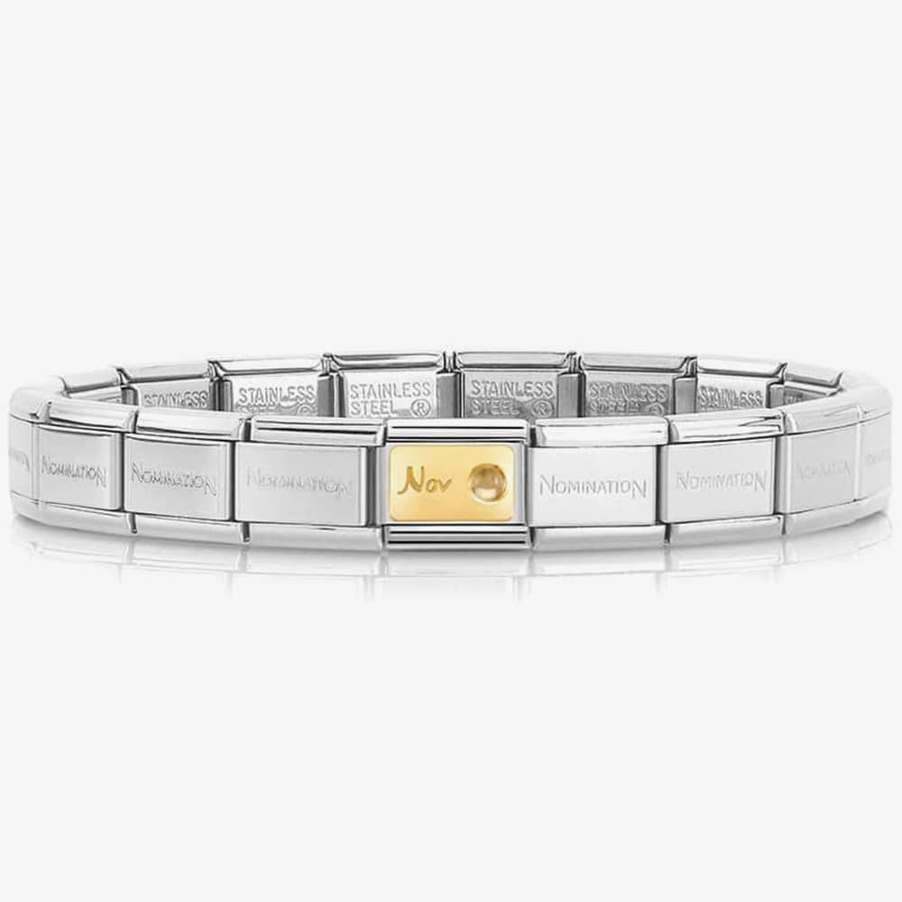 The Nomination CLASSIC Composable Plates November Citrine 030519/11 features a bonded yellow gold plate with the engraving Nov & a yellow Citrine stone which is set on a stainless-steel base.