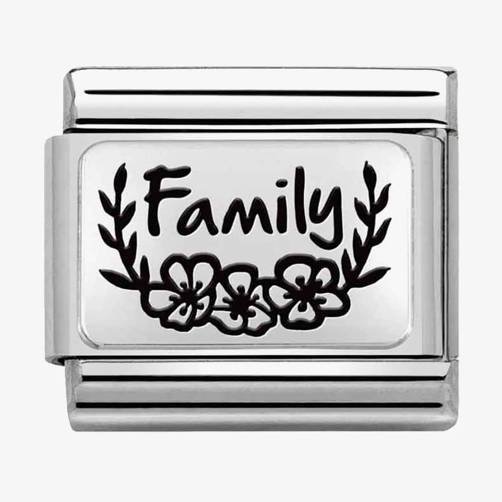 The Nomination CLASSIC Composable Plates Family with Flowers Charm 330111/33 features a sterling silver plate with the wording Family and a fancy floral design in black enamel detailing which is set on a stainless-steel base.