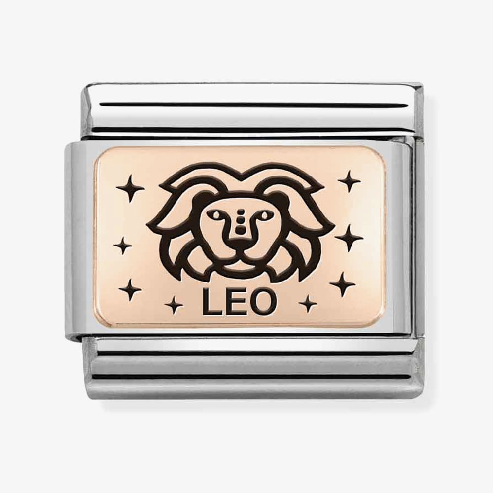The Nomination CLASSIC Composable Plates Leo Charm 430112/05 features a bonded rose gold plate with the wording Leo & the Star sign motif in black enamel detailing which is set on a stainless-steel base.