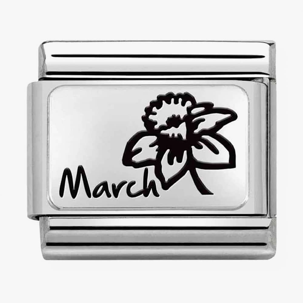 The Nomination CLASSIC Composable Plates March Flower Charm 330112/15 features a sterling silver plate with the wording March and a daffodil flower design in black enamel detailing which is set on a stainless-steel base.