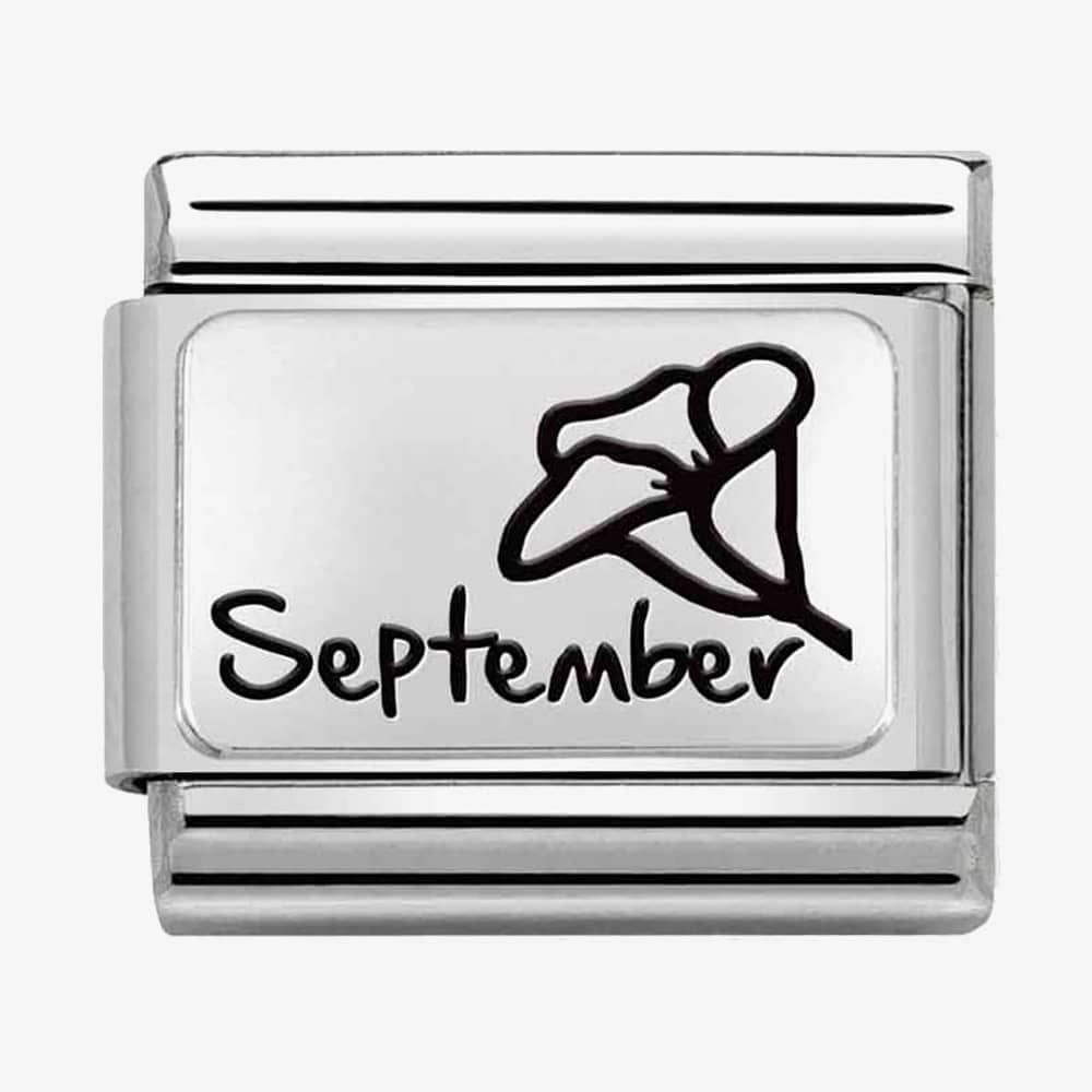 The Nomination CLASSIC Composable Plates September Flower Charm 330112/21 features a sterling silver plate with the wording September and a morning glory flower design in black enamel detailing which is set on a stainless-steel base.
