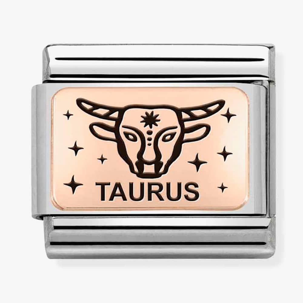 The Nomination CLASSIC Composable Plates Taurus Charm 430112/02 features a bonded rose gold plate with the wording Taurus & the Star sign motif in black enamel detailing which is set on a stainless-steel base.