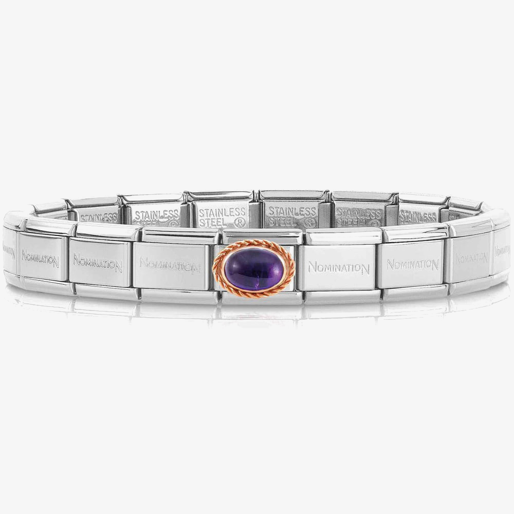 Nomination bring us this stylish CLASSIC Composable bracelet. Featuring a stainless steel bracelet with the CLASSIC Amethyst Charm, created in stainless steel with a 9ct Rose Gold twisted rope design surrounding a stunning amethyst stone. Wear individually or with other Nomination bracelets for a stacking look.