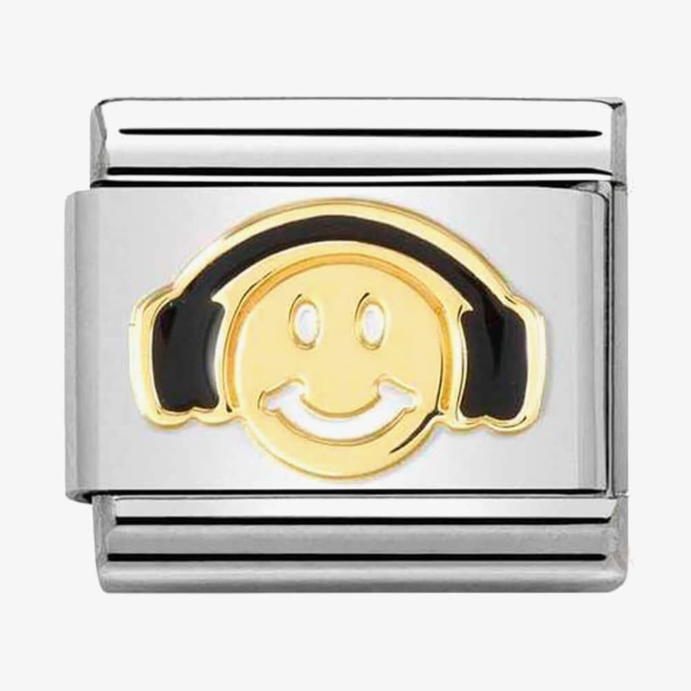 The Nomination CLASSIC Composable Symbols Smile With Headphones Charm 030272/56 features a bonded yellow gold smiling face with white enamel detailing and black enamel headphones, on a stainless steel base.