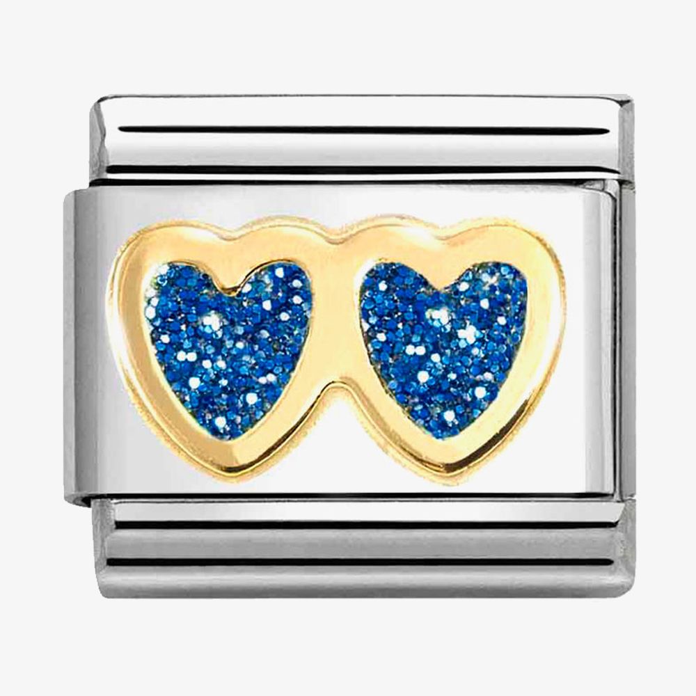 The Nomination CLASSIC charm is crafted from a stainless-steel base with an 18ct yellow gold double heart, set with blue enamel glitter. A stunning charm to add some sparkle to your bracelet.