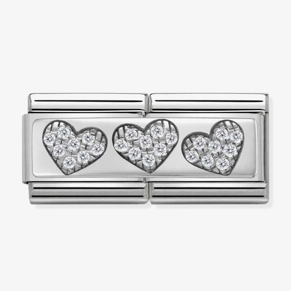 Stylise your outfit with this dazzling charm from Nomination, suitable for any classic bracelet. The design features a double link design complete with 3 cubic zirconia hearts set in a stainless steel base.
