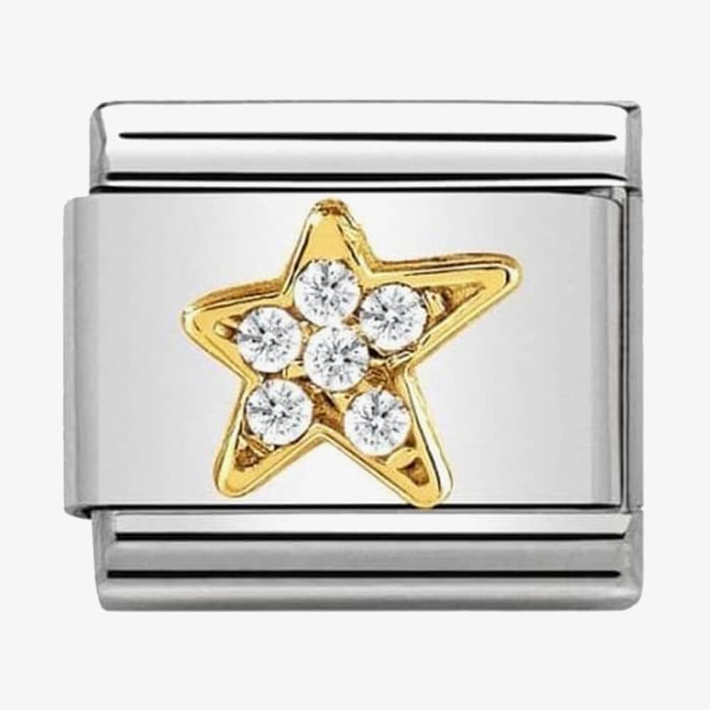 An eye catching stainless steel link handcrafted with a 18ct yellow gold Asymmetric Star symbol set with white cubic zirconia stones, an ideal way to add a touch of sparkle to your bracelet.