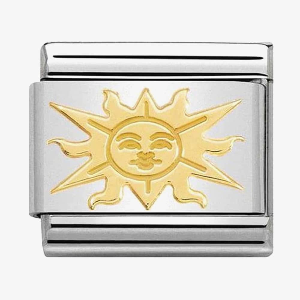 Brighten up your bracelet with this stainless steel link crafted with a 18ct gold sun with a face, the perfect link for sun worshippers.