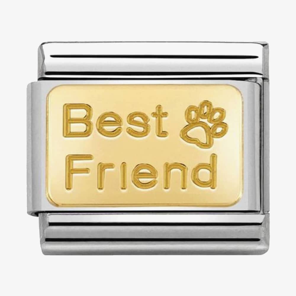 Celebrate man's best friend with this adorable link charm. Crafted in sterling silver, this stunning link charm features an 18ct gold plaque detail with 'best friend' and paw engraving.