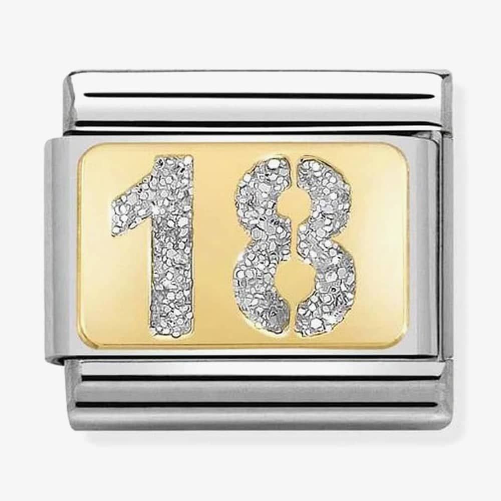 A stainless steel charm from Nomination. The charm features an 18ct gold glitter enamel set number 18.