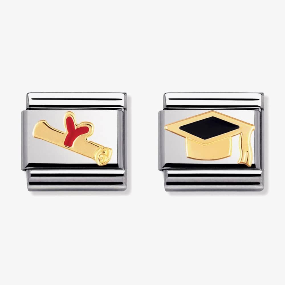 This stylish charm set from Nomination is the perfect way to celebrate a Graduation. The pair of links feature diploma and Graduation cap designs crafted from Stainless Steel with 18ct Gold detailing and coloured enamel.
