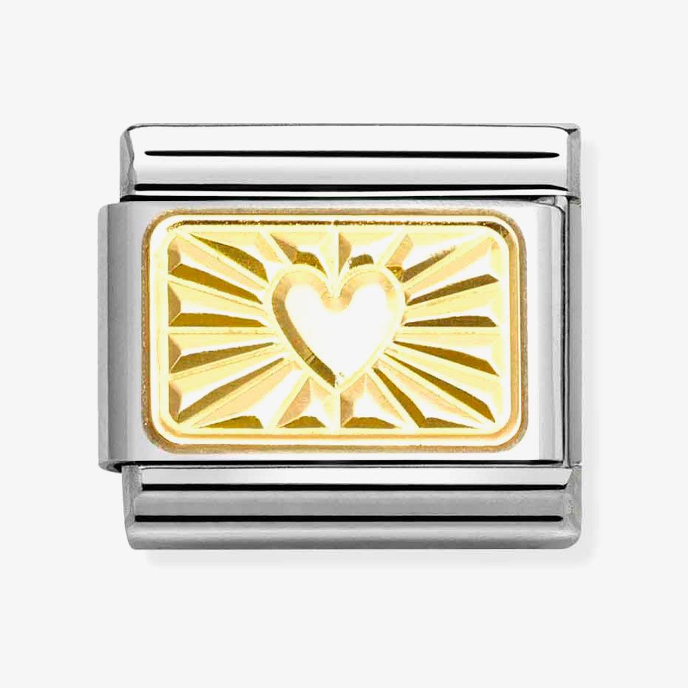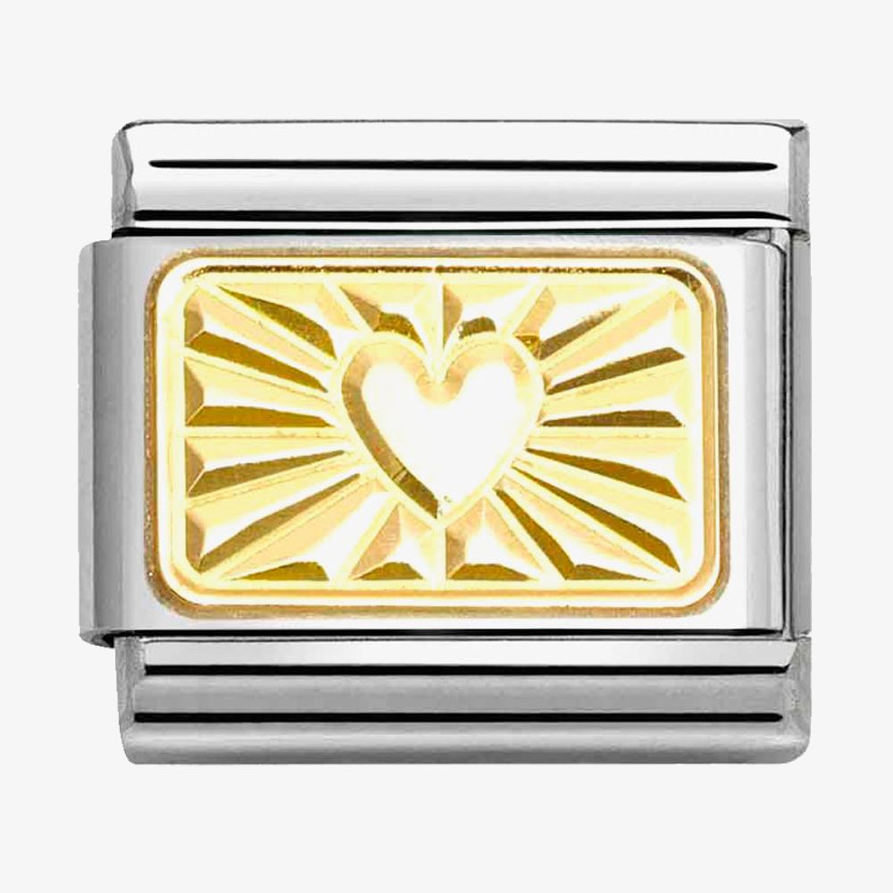 Discover the Nomination Composable CLASSIC Charm, a symbol of love. Featuring a heart in the centre and surrounded by etchings of sunrays in gold on stainless steel.