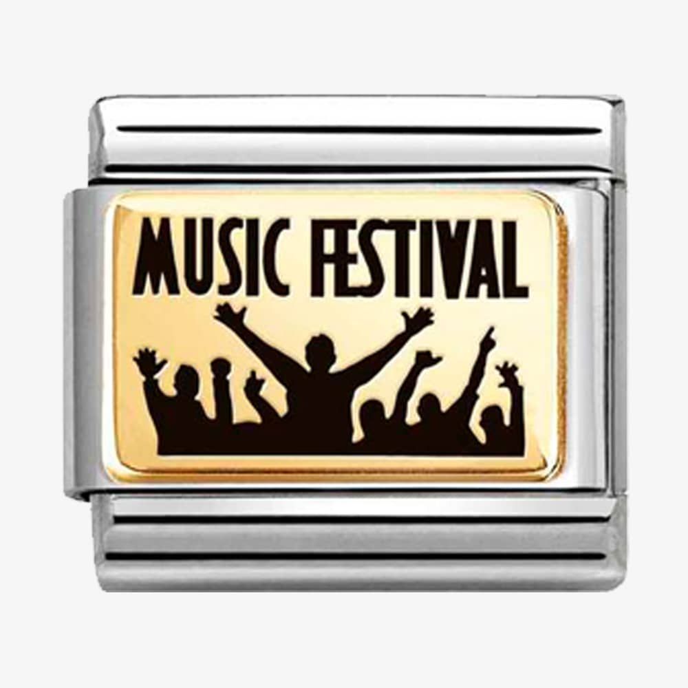 Immerse yourself in the electrifying energy of music festivals with this captivating stainless steel charm, elevated by an 18ct gold plate and detailed black enamel engraving. Featuring the words "Music Festival" accompanied by a lively scene of a crowd dancing and revelling in the music, this charm captures the essence of joy and camaraderie.