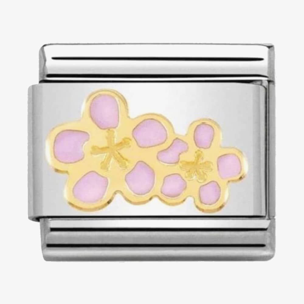 Add some spring colours to your collection, with this stainless steel link for the Composable CLASSIC bracelet featuring 18ct gold peach blossom flowers crafted with peach/pink enamel.