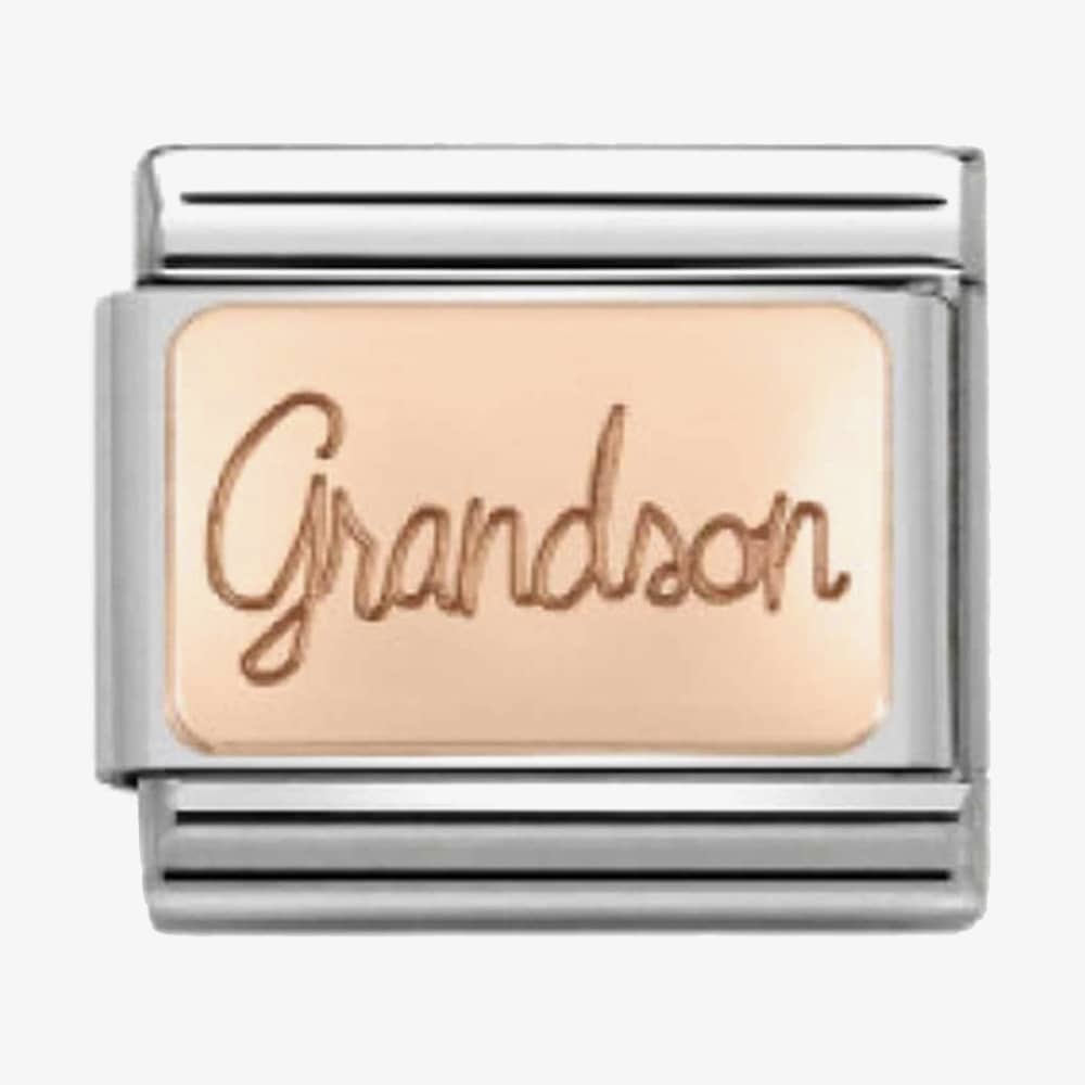 The Nomination Classic Grandson charm is a great way to show everyone how much your Grandson means to you. The stainless steel base link is adorned with a 9ct Rose Gold, and engraved with the words Grandson. A wonderful addition to any style, perfect for including family in your unique story.