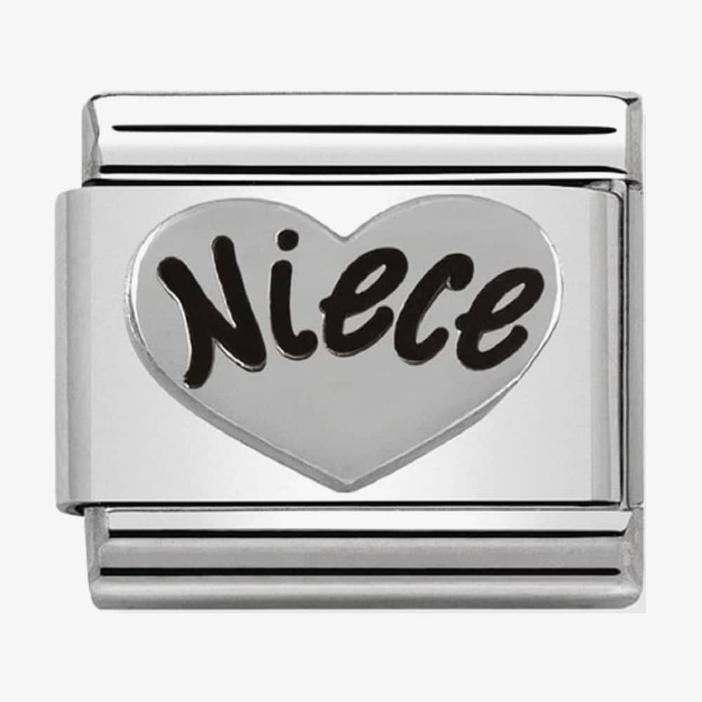 A classically styled charm which features the word Niece written in black enamel that sits on a heart shaped design, crafted from stainless steel.