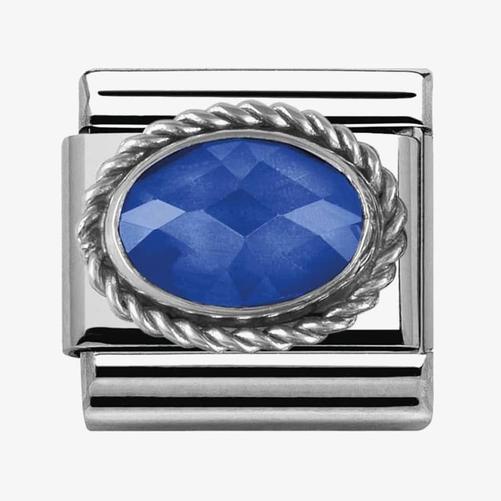 This ornate design is brought to us by Nomination Jewellery. Crafted from stainless steel, the bright blue faceted zirconia sits securely within an ornate plaited style setting. Perfect for adding tone and depth to your Classic bracelet.